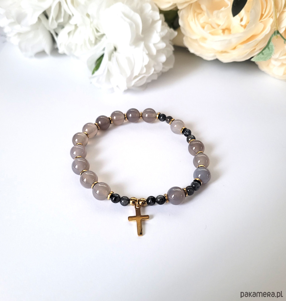 Bransoletka- różaniec na rękę z kamieni naturalnych: Agatu, Labradorytu oraz Hematytu.