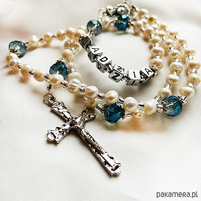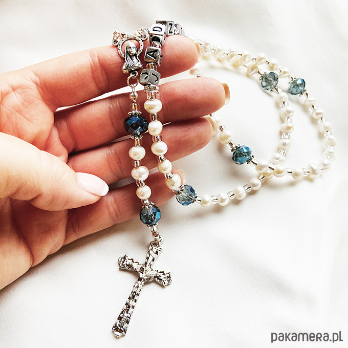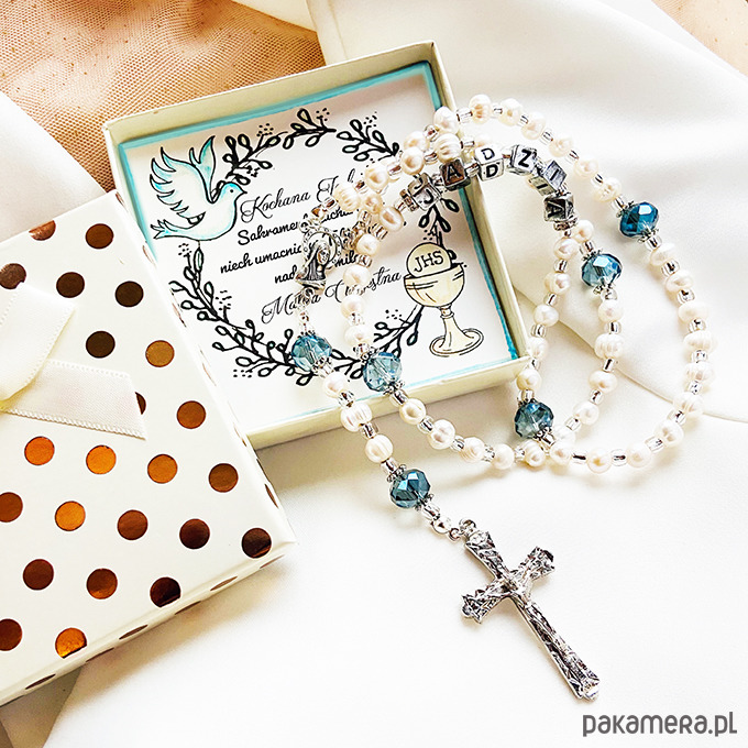 Unikalny personalizowany prezent z okazji Pierwszej Komunii lub Chrztu. Zawiera różaniec z naturalnych pereł z wybranym imieniem i krzyżykiem oraz kartę z życzeniami.