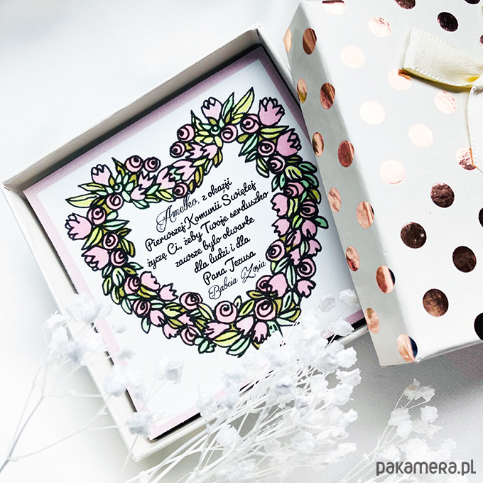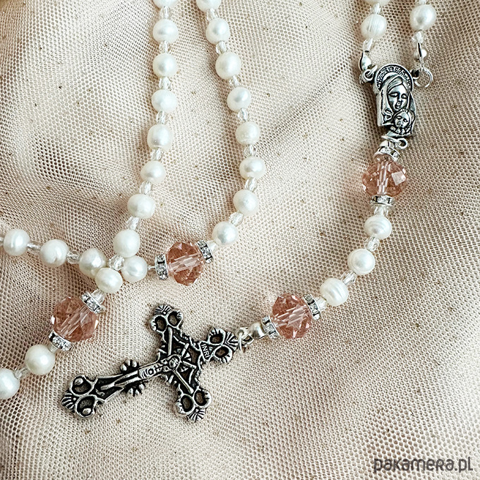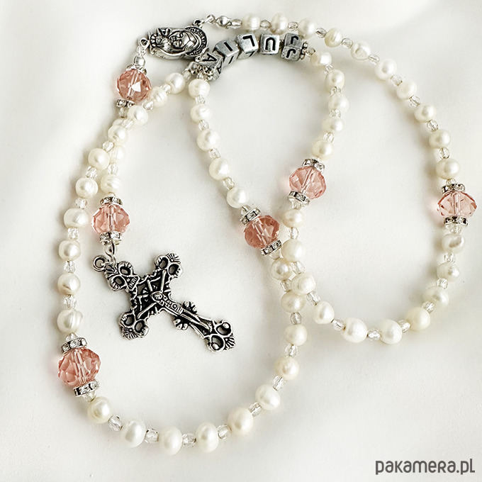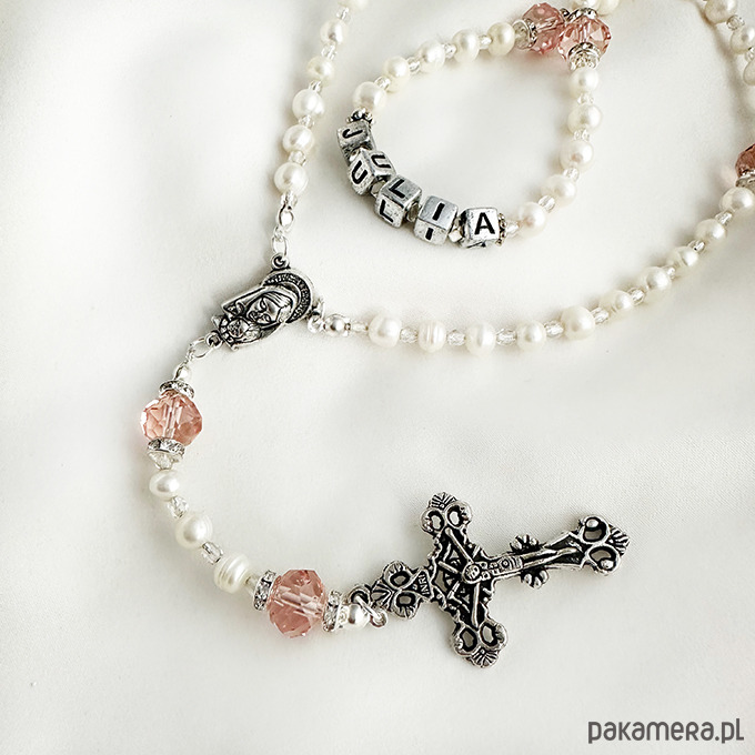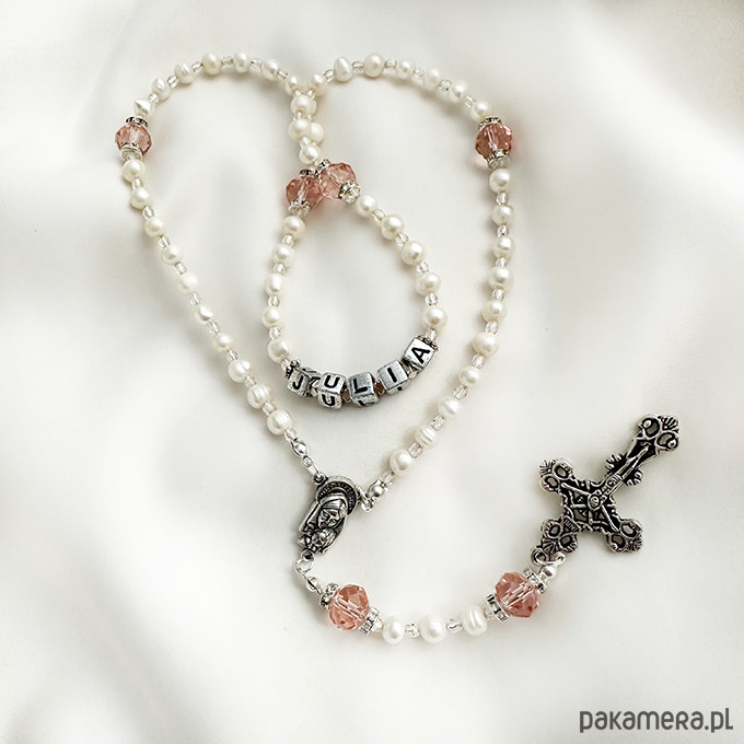 Bardzo piękny , wyjątkowy prezent z okazji Pierwszej Komunii, Chrztu lub Bierzmowania. Zawiera różaniec z naturalnych pereł z wybranym imieniem i krzyżykiem oraz wykonaną ręcznie kartę z życzeniami.