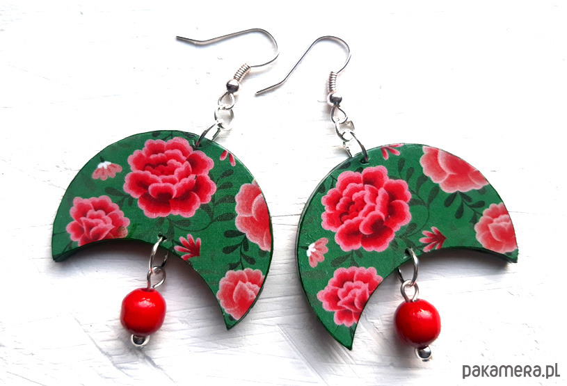 kolczyki drewniane, ozdobione metodą decoupage, dwustronne, starannie wykończone farbami akrylowymi i zabezpieczone wielokrotnie lakierem, koraliki drewniane, bigle posrebrzane, długość kolczyków bez bigli: 5 cm, szerokość: 4 cm, bardzo lekkie