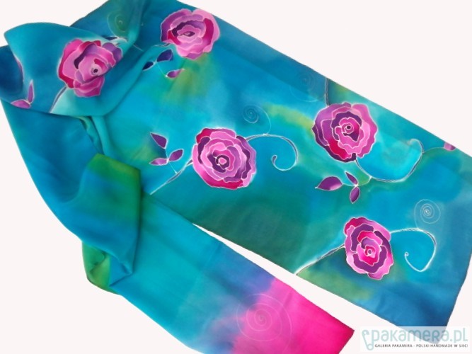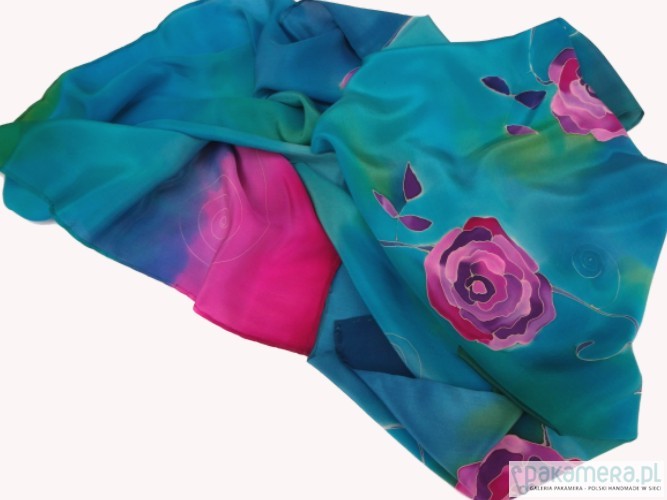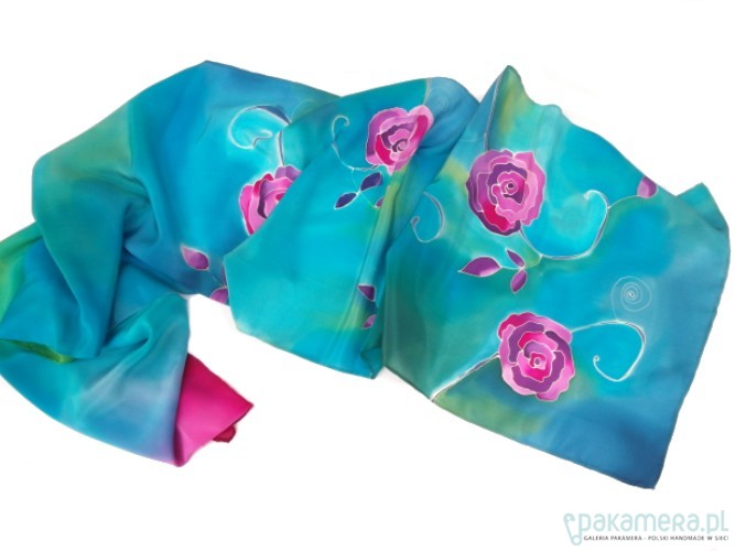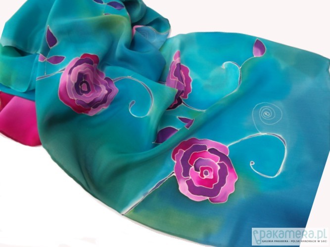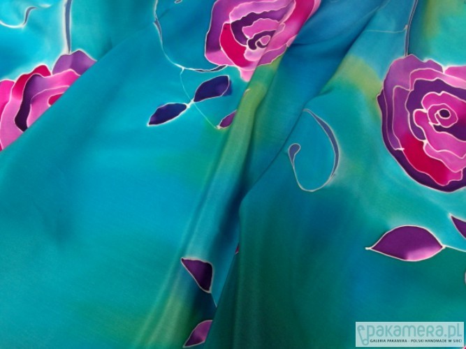 Szal z motywem fioletowo-różowych róż na tle turkusów zimnego morza. Naturalny, szlachetny, mieniący się jedwab, doskonały zarówno na jesienne i zimowe chłody, jak i letnie upały. Wymiary pracy to38x180cm. Wzór malarski zajmuje około 30% powierzchni szala. Praca opatrzona jest certyfikatem pochodzenia/autentyczności, uzupełnionym o przepis prania ręcznego. Całość zamyka się w pięknym opakowaniu z ozdobnego kartonu, przepasanym rafią.