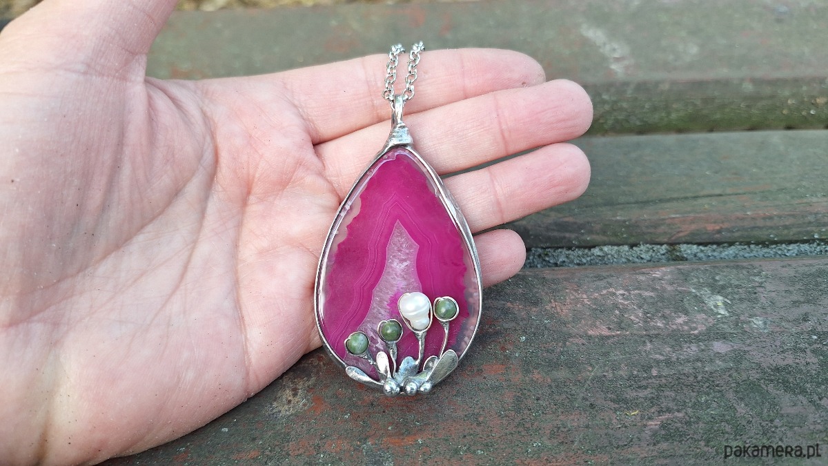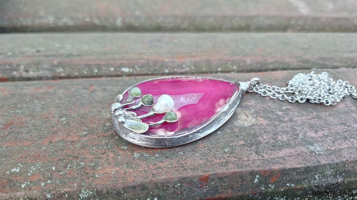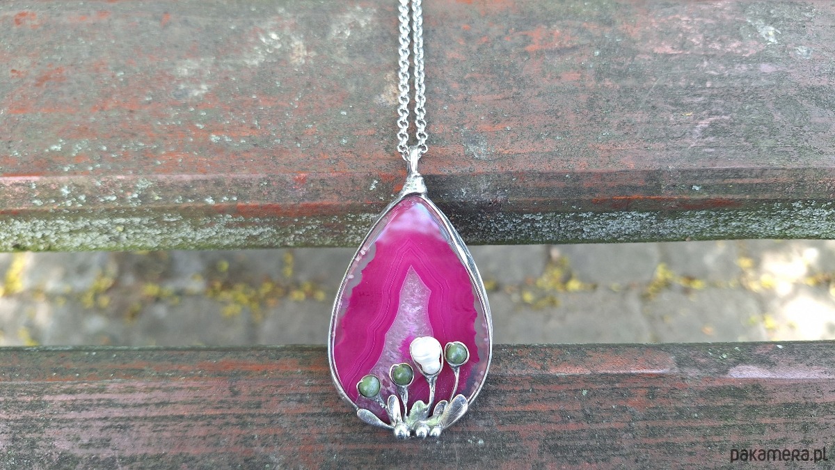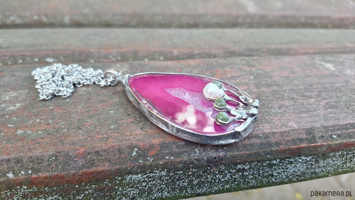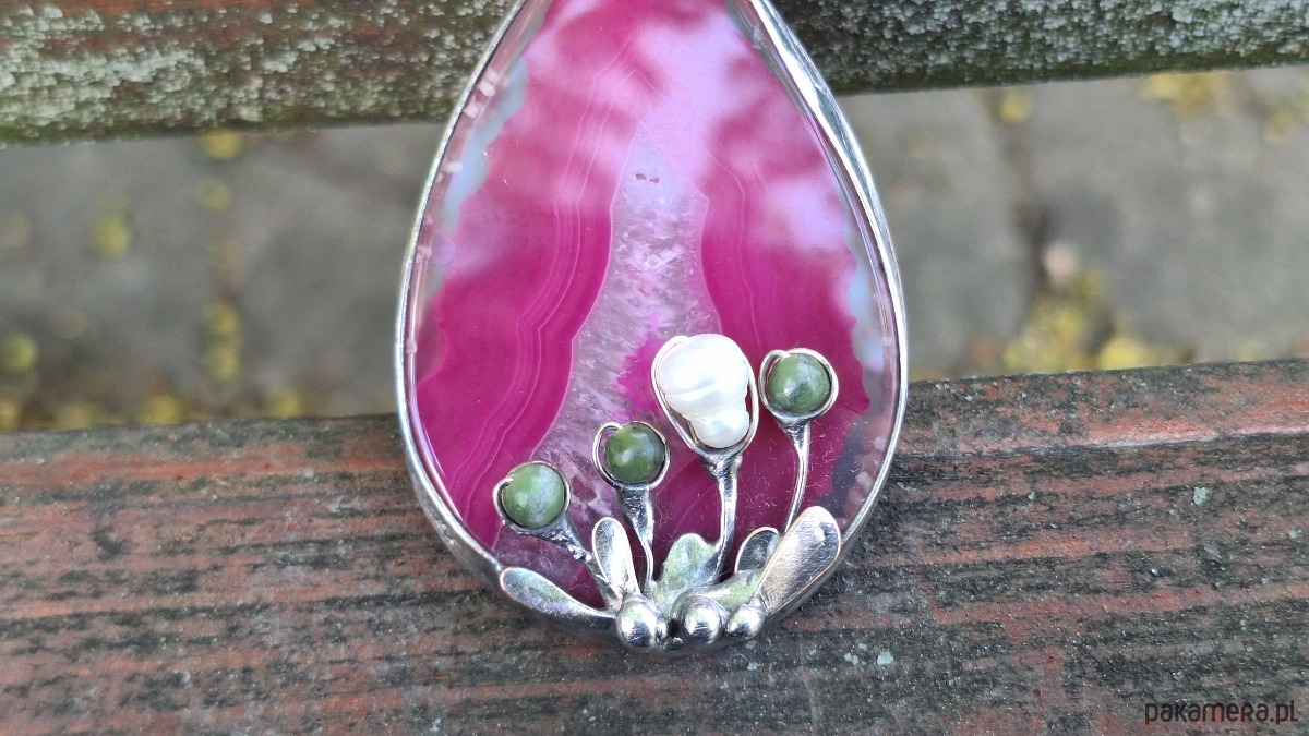 Wisiorek wykonany z miedzi, cyny, agatu, perły i nefrytu. Wymiary ok. 6.5 na 4 cm. Zawieszony na łańcuszku o długości ok. 50 cm.