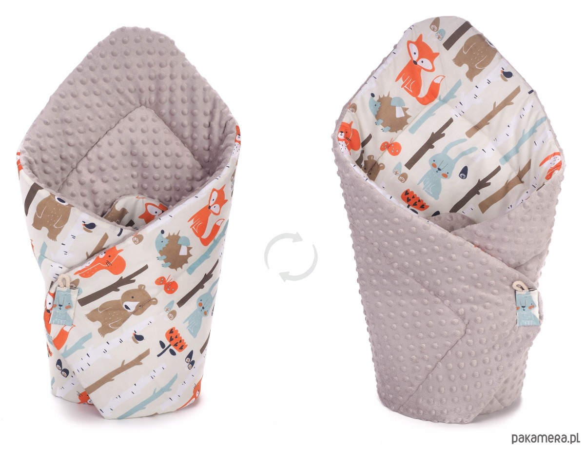 Wykonany jest z wysokiej jakości wzorzystej tkaniny,natomiast drugą stronę stanowi niezwykle miękka i przyjemna dla skóry tkanina minky o gramaturze 380g. Zapinany jest na solidny rzep zapewniająca bezpieczeństwo użytkowania.