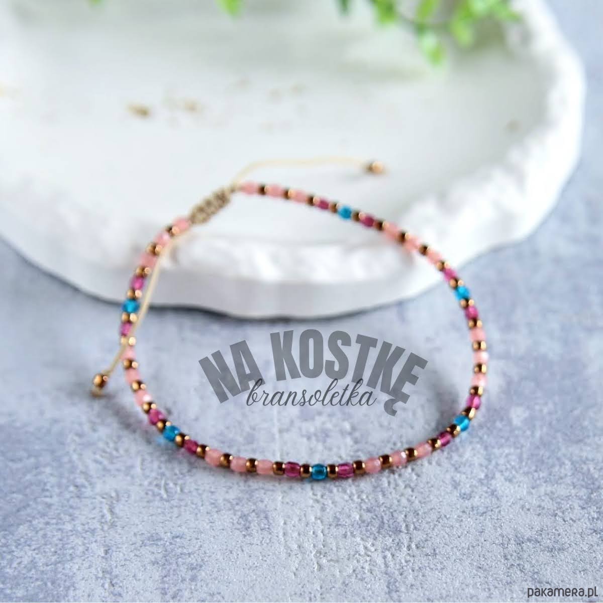 Bransoletka do noszenia na nodze/kostce ze szklanych koralików - szlifowanych w odcieniach różu z turkusowo-morskimi akcentami oraz mniejszych w kolorze ciemnego złota.