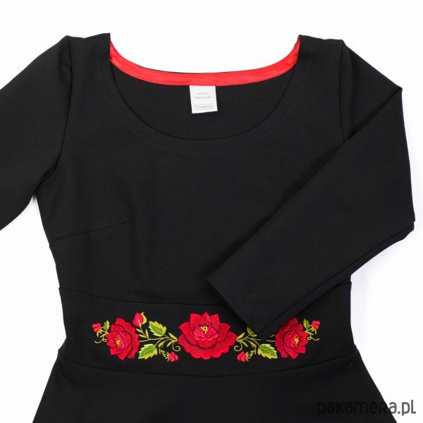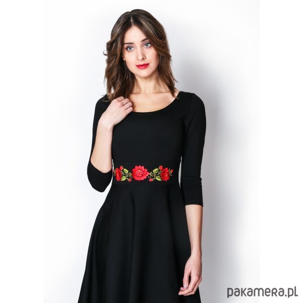 Czarna, klasyczna i rozkloszowana sukienka o długości midi z pięknym kwiatowym haftem ludowym – łowickimi różami. Kobiecy krój w stylu lat 50-tych w połączeniu z głęboką czernią i haftowanymi czerwonymi różami, sprawi że poczujesz się w tej sukience kobieco i elegancko.