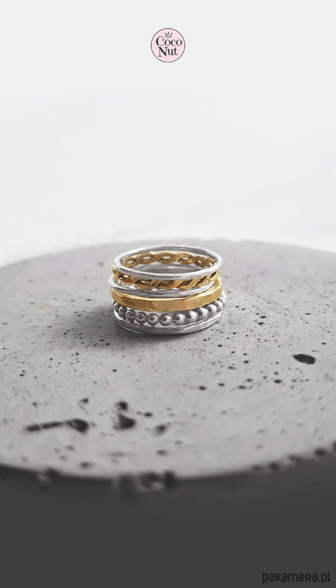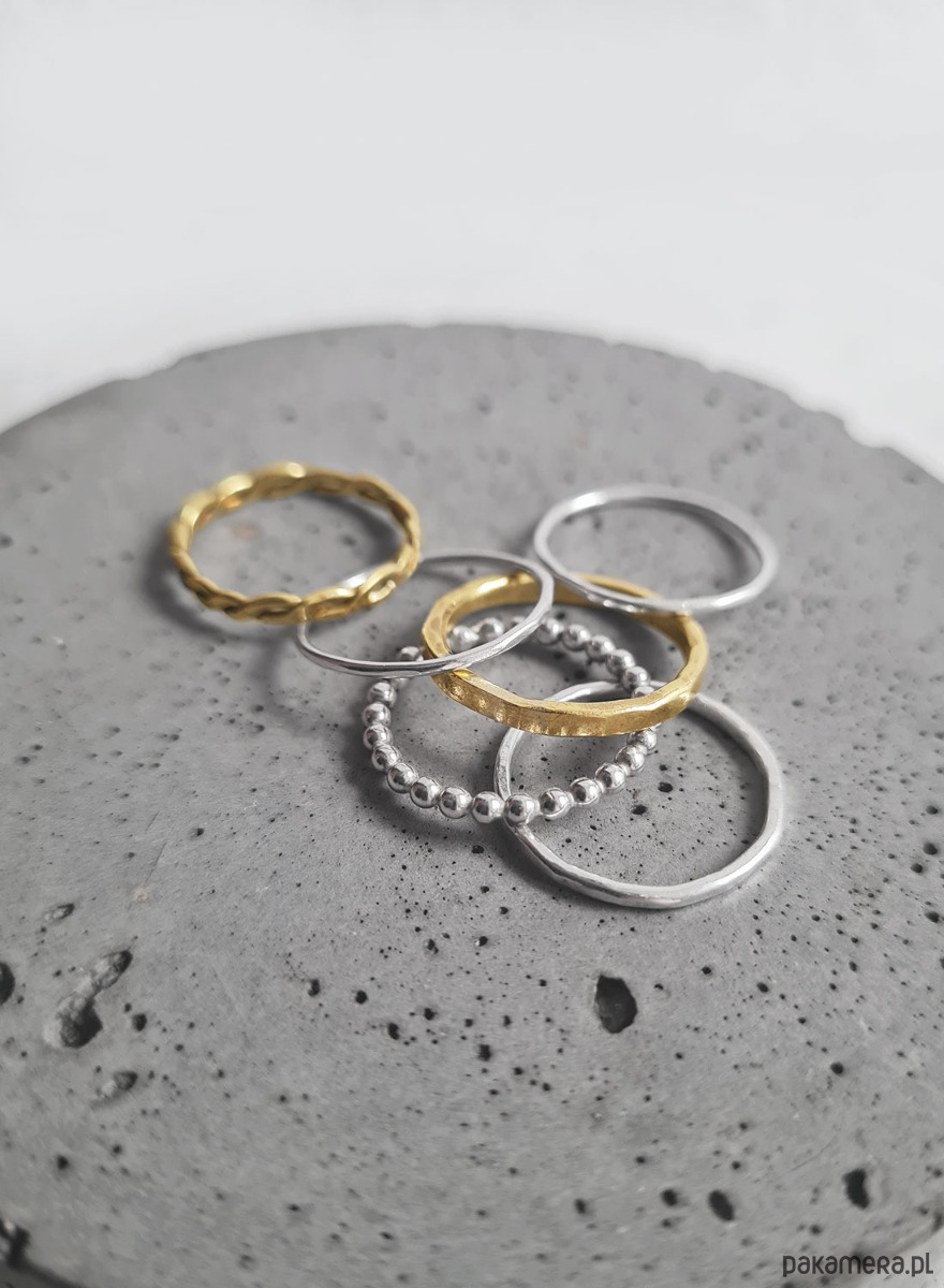 Komplet 6 obrączek w rozmiarze 13: wykonane ze srebra 925 oraz mosiądzu, o szerokości ok. 1-1,5 mm.