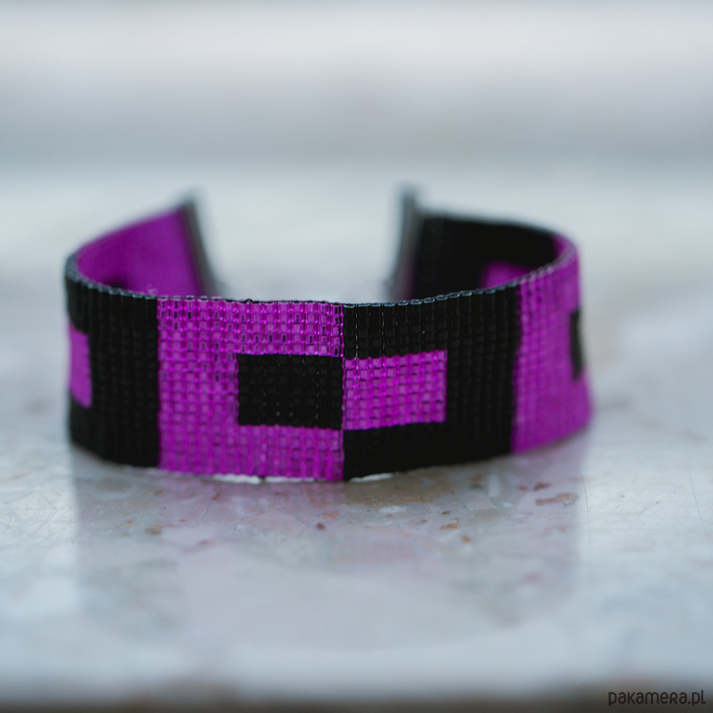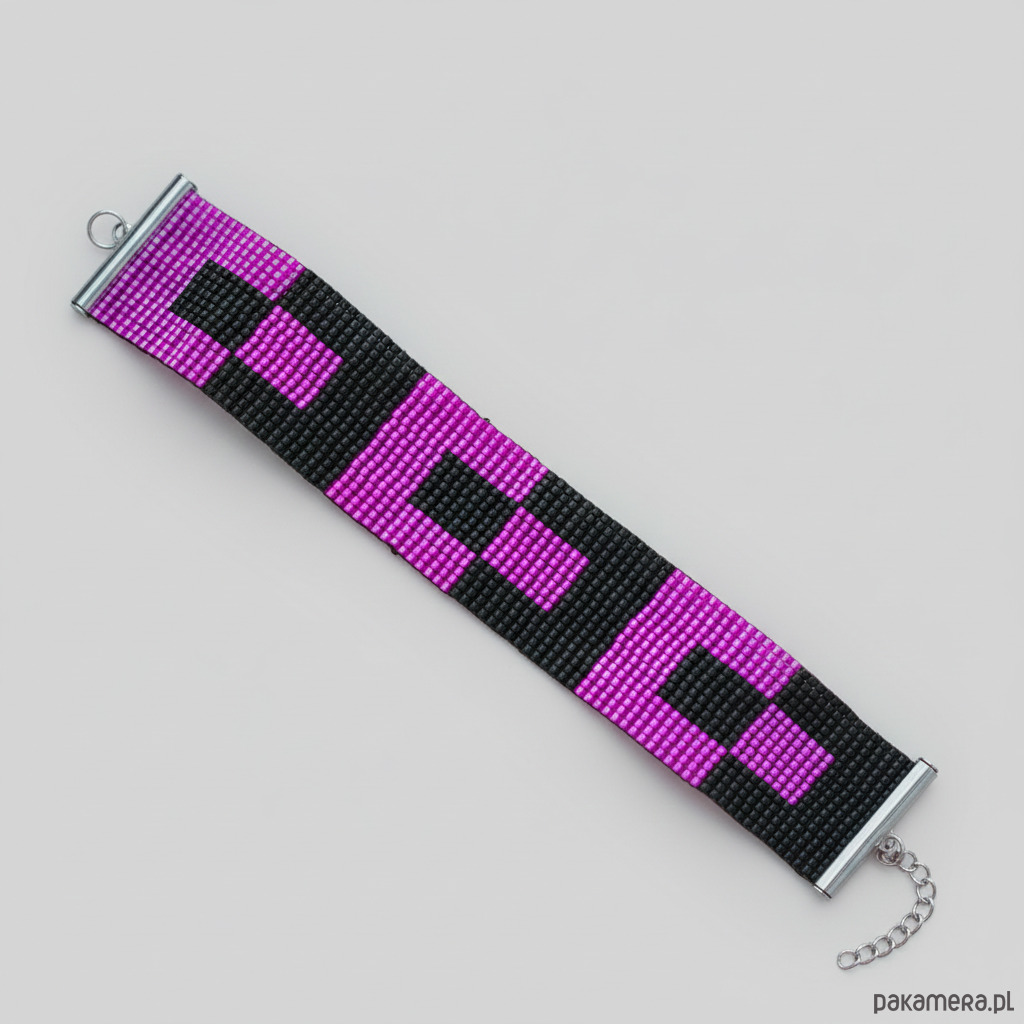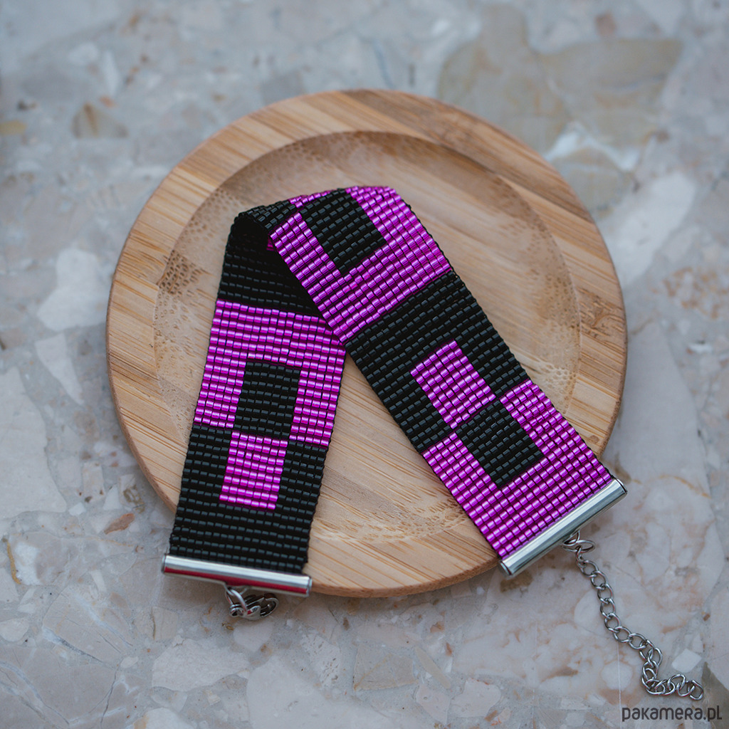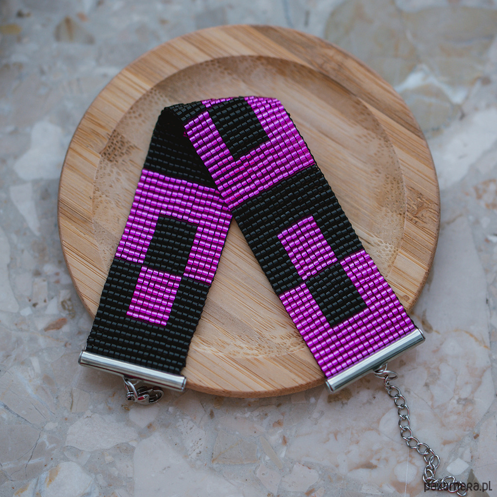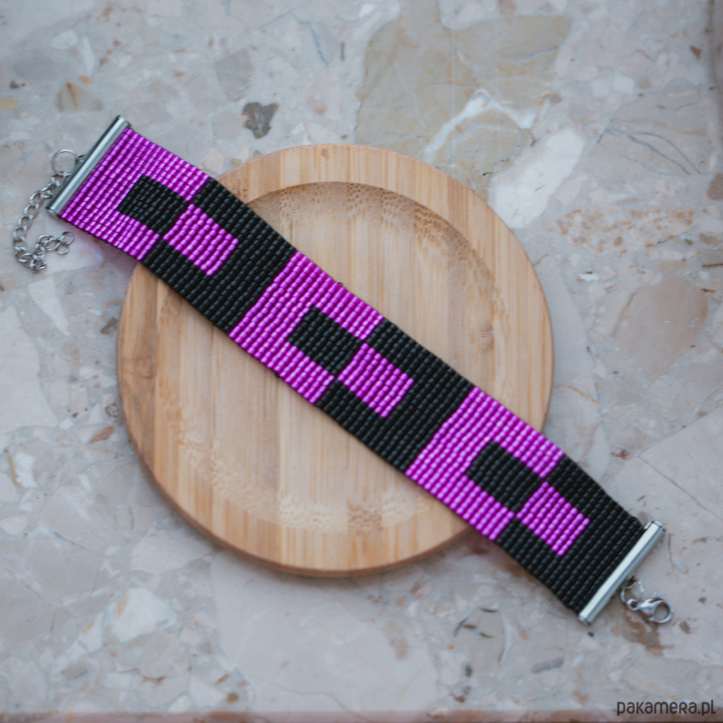 Odkryj piękno i elegancję naszej bransoletki różowo-czarnej, starannie wykonanej na krośnie. Ta płaska bransoletka ozdobiona jest wyjątkowymi wzorami geometrycznymi, które dodają jej unikalnego charakteru i stylu. Idealnie komponuje się z różnorodnymi stylizacjami, nadając im wyjątkowego uroku.