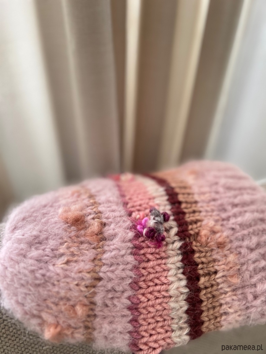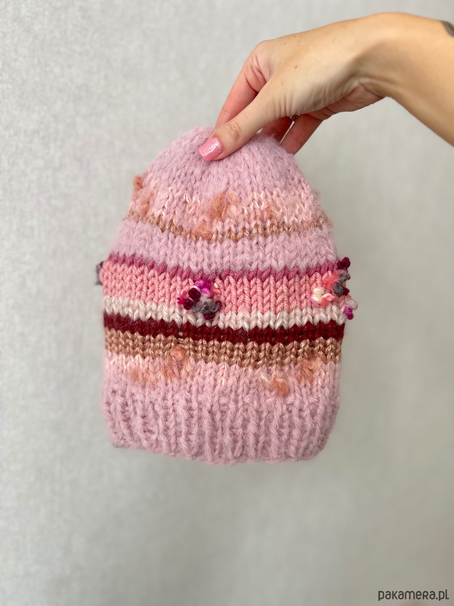 Czapka z delikatnej, miękkiej włóczki. baza to 74% alpaka 25% merino 4% poliamid. W ozdobnych paskach merino, alpaka, akryl.
