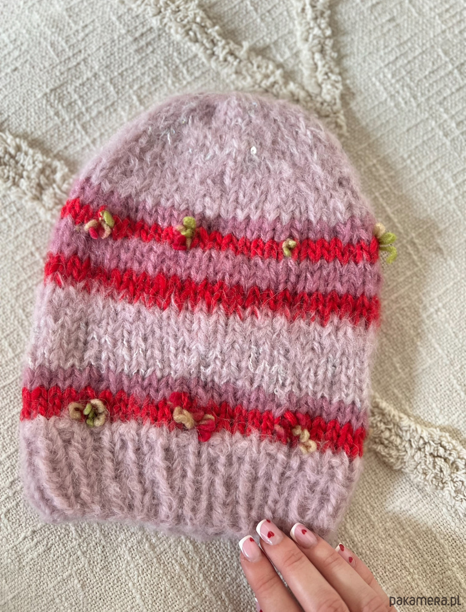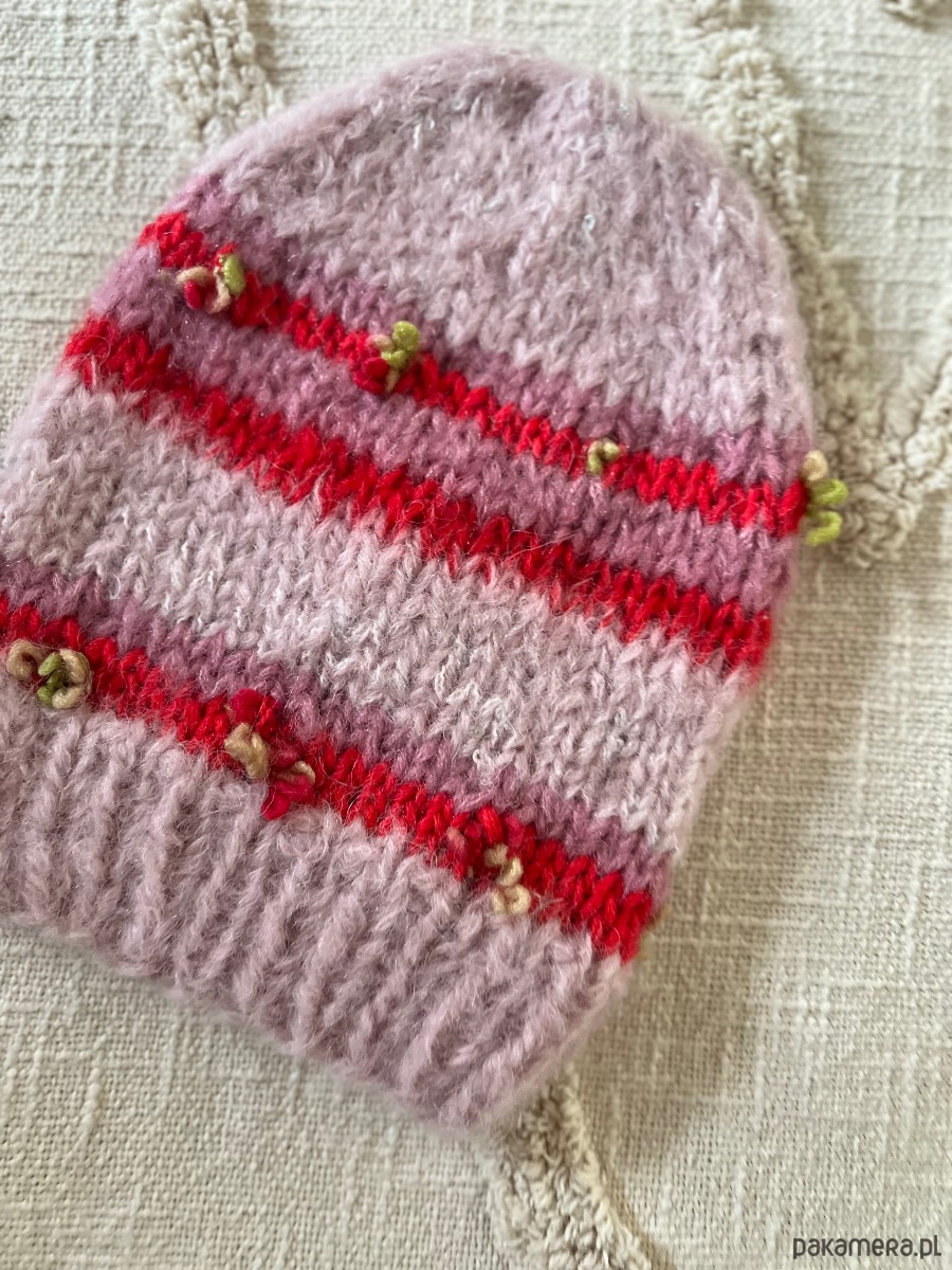 Czapka z delikatnej, miękkiej włóczki. baza to 74% alpaka 25% merino 4% poliamid. W ozdobnych paskach merino, alpaka, akryl.