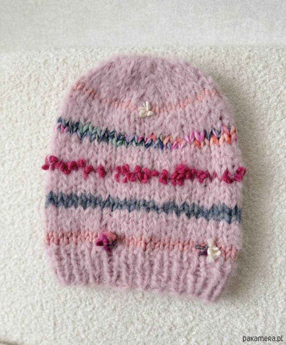 Czapka z delikatnej, miękkiej włóczki. baza to 74% alpaka 25% merino 4% poliamid. W ozdobnych paskach merino, alpaka, akryl.