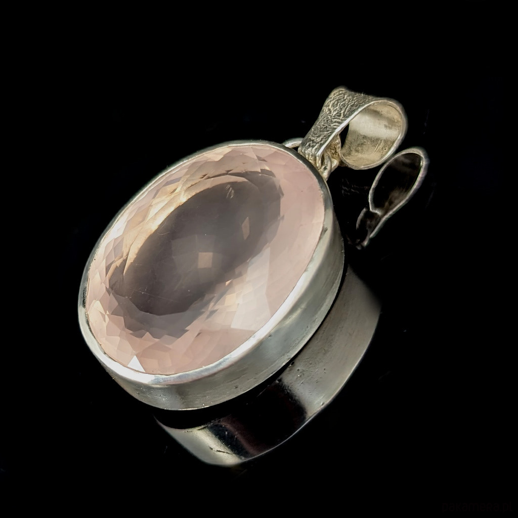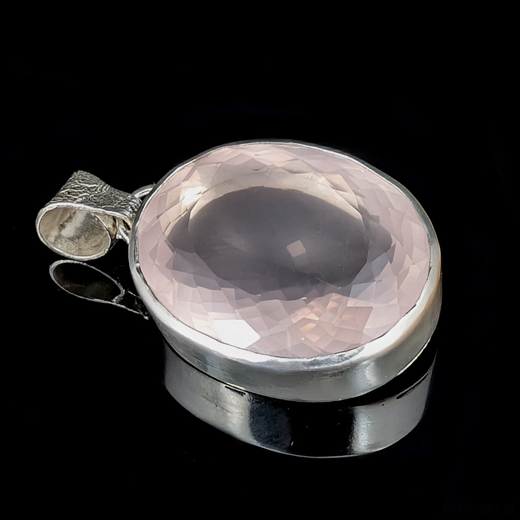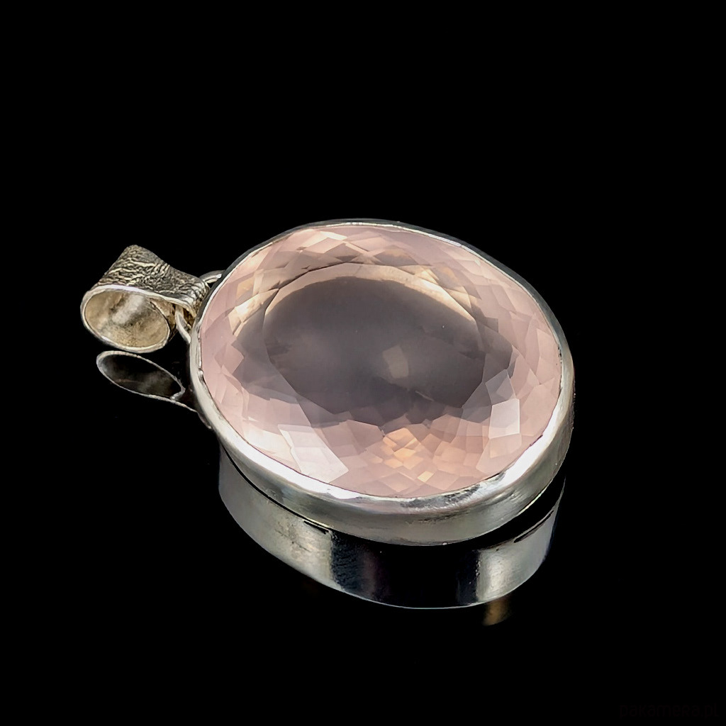 Pięknie szlifowany kwarc różowy o idealnej przejrzystości oprawiony w wisior wykonany ze srebra próby 925. Wymiary oprawy 32 x 25 mm, długosć z krawatką 42 mm, waga 18,3 g. Tył wisiorka jest otwarty ukazując piękno kamienia w cąłej okazałości. Wisior zostanie wysłany w ozdobnym pudełeczku.
