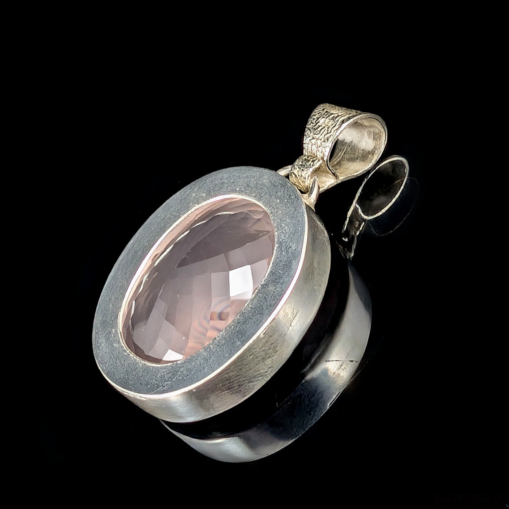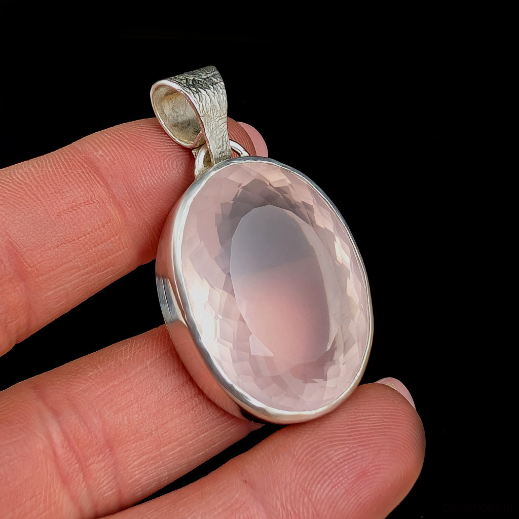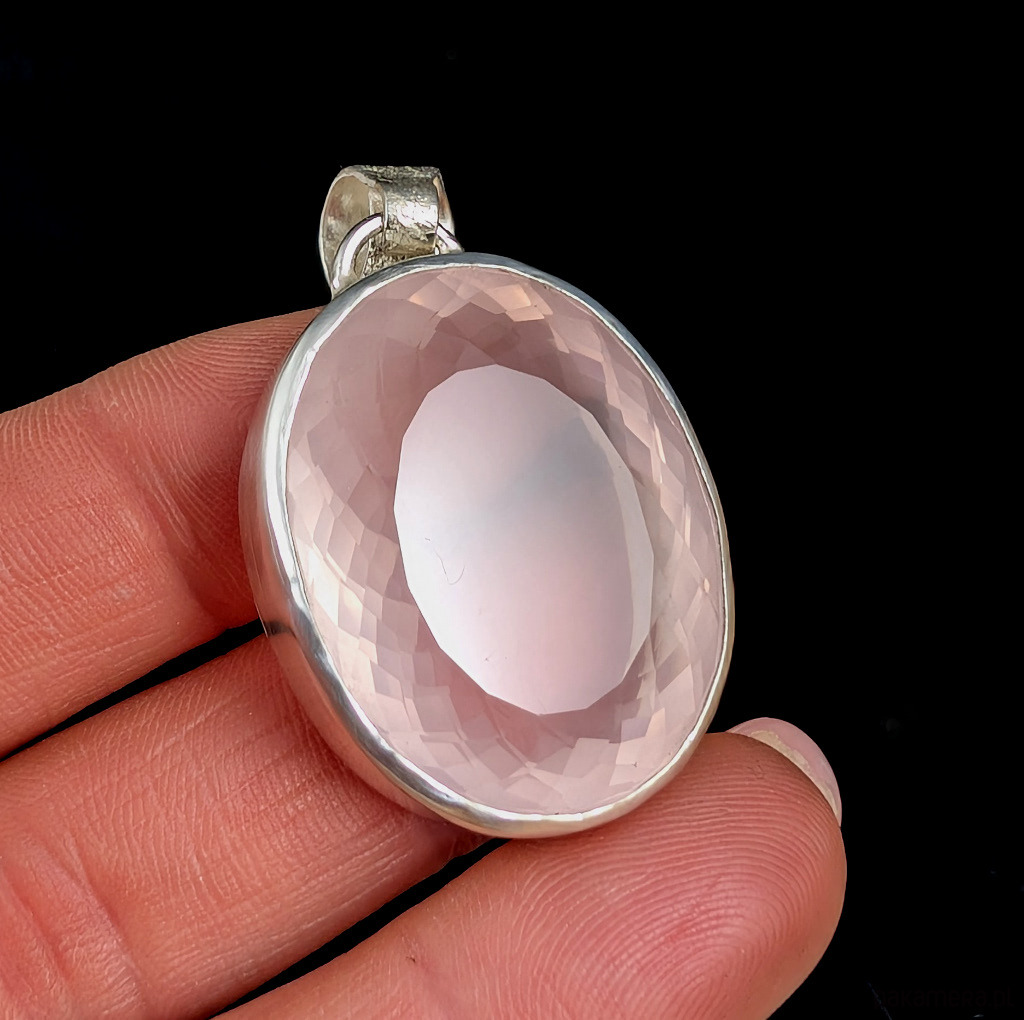 Pięknie szlifowany kwarc różowy o idealnej przejrzystości oprawiony w wisior wykonany ze srebra próby 925. Wymiary oprawy 32 x 25 mm, długosć z krawatką 42 mm, waga 18,3 g. Tył wisiorka jest otwarty ukazując piękno kamienia w cąłej okazałości. Wisior zostanie wysłany w ozdobnym pudełeczku.