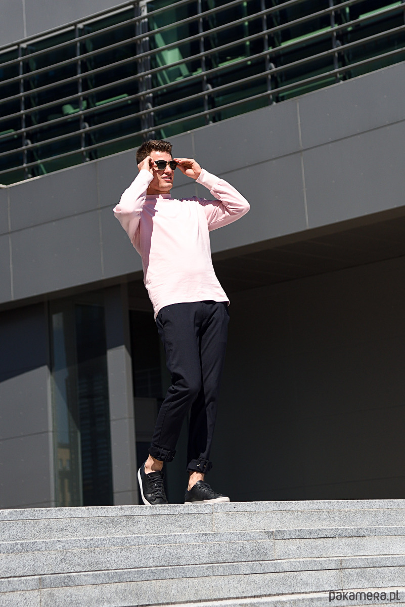 Bluza wykonana z dzianiny pętelkowej z bawełny. Rękaw jest wykończony ściagaczem. Przy dekolcie stójka jest nietuzinkowo wykończona. Ciekawie poprowadzone linie cięć w konstrukcji przełamuje prostotę kroju. Kolor to bardzo jasny róż.