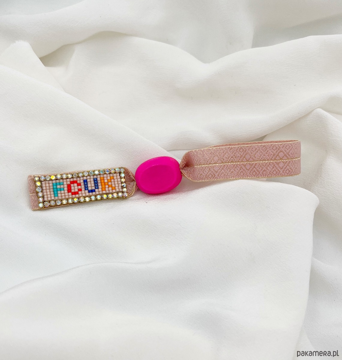 Bransoletka inspirowana opaskami, jakie dostajemy wchodząc np. na imprezę, koncert do loży VIP... Atłasowa sterczowa taśma, różowo złota, ręcznie tkany napis z japońskich szklanych koralików - FCUK . Napis obramowany różową taśmą cyrkoniową z opalizującymi kryształkami. Wielkość regulowana drewnianą kuleczką choć taśma jest na tyle ,,gumowa", że nie trzeba przesuwać drewnianej części.
