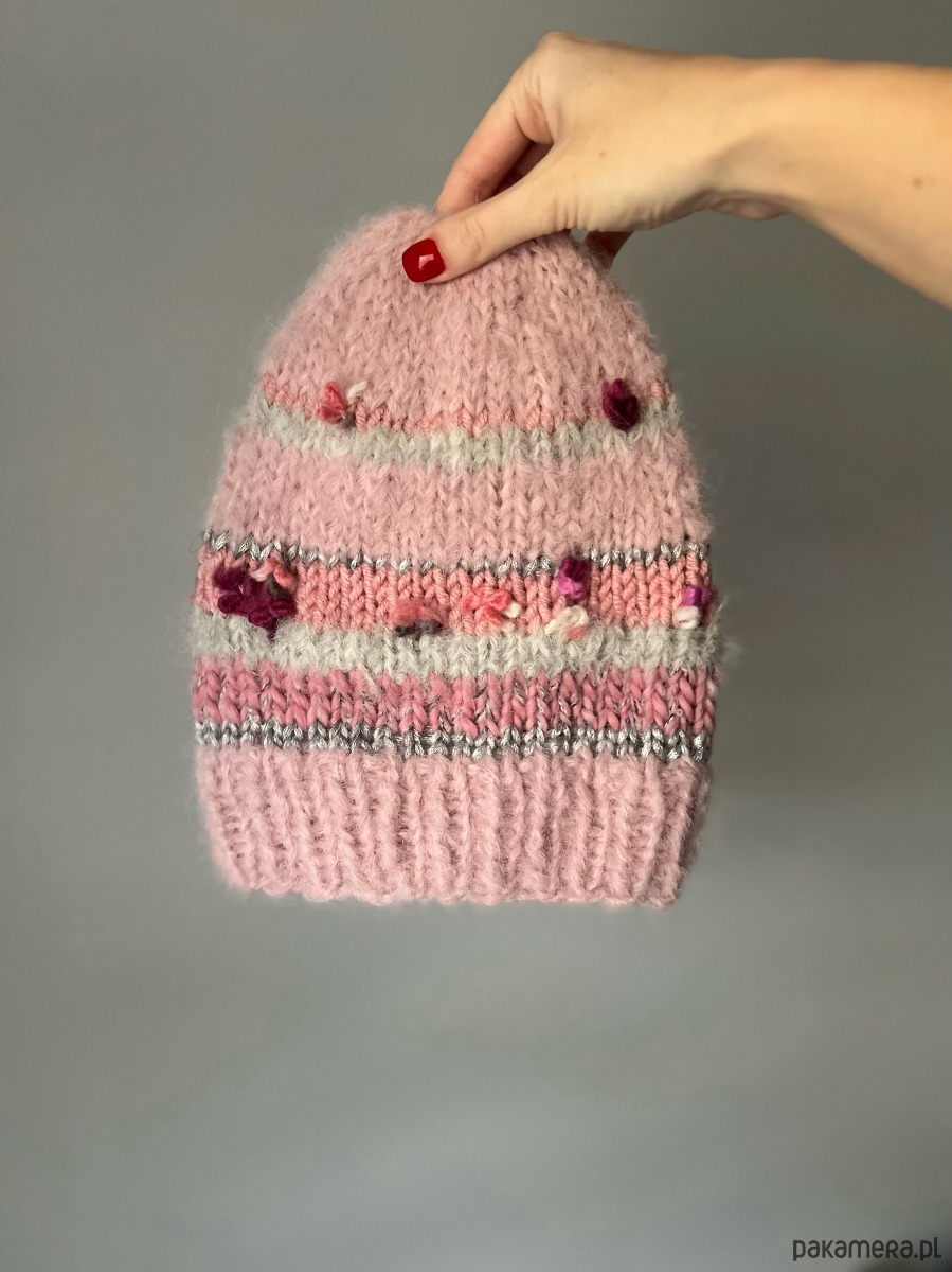 Piękna czapka z podstawowej różowej włoczki alpaka i merino tylko z 4% domieszką poliamidu. Z dodatkiem włóczki artystycznej oraz innych fantazyjnych włóczek o różnym składzie