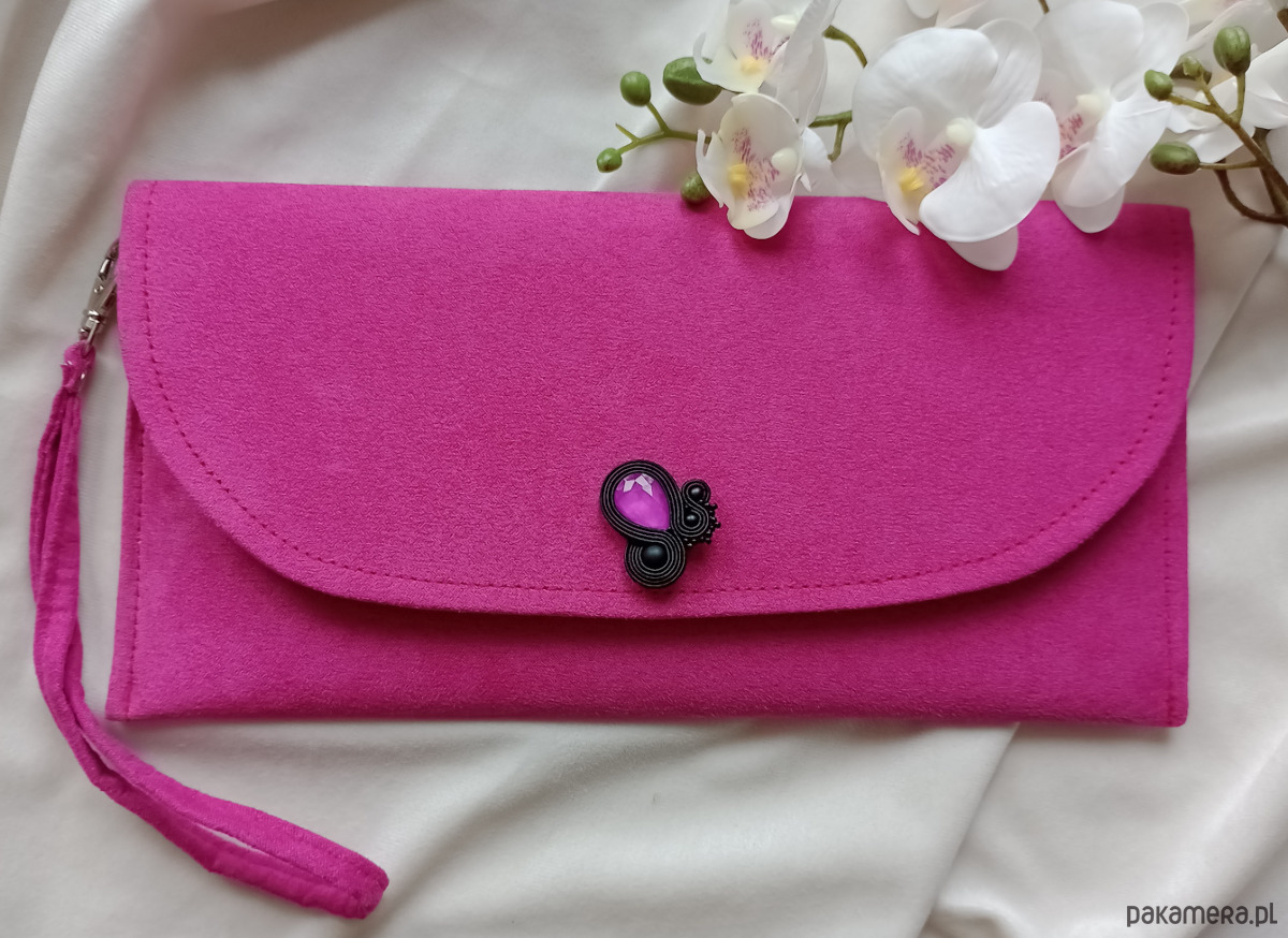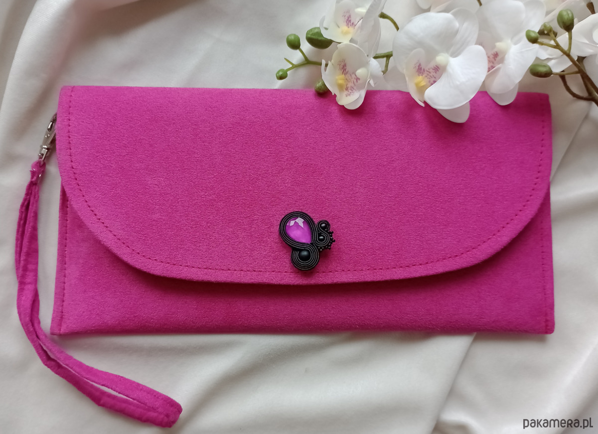 Torebka kopertówka z haftem soutache (sutasz), Różowa kopertówka, torebka do ręki fuksja, różowa torebka.