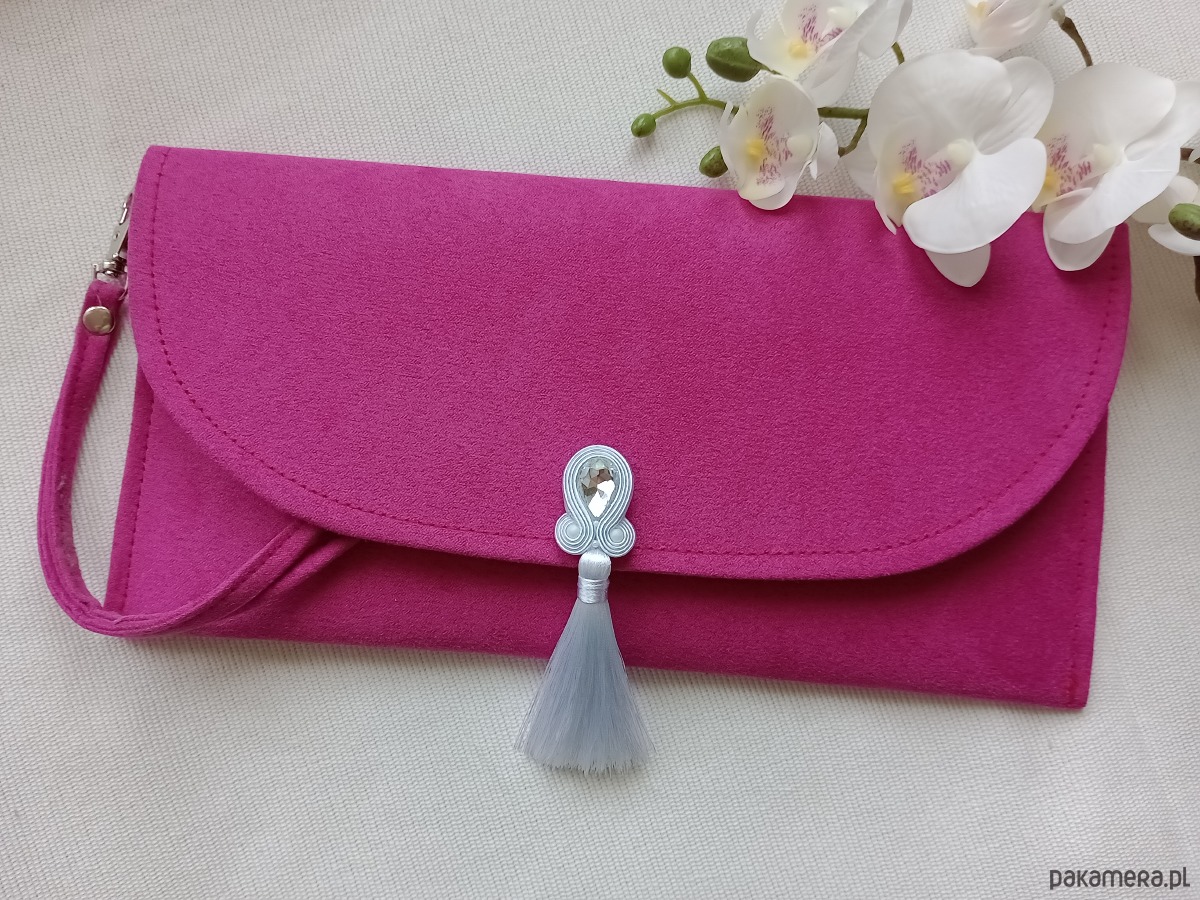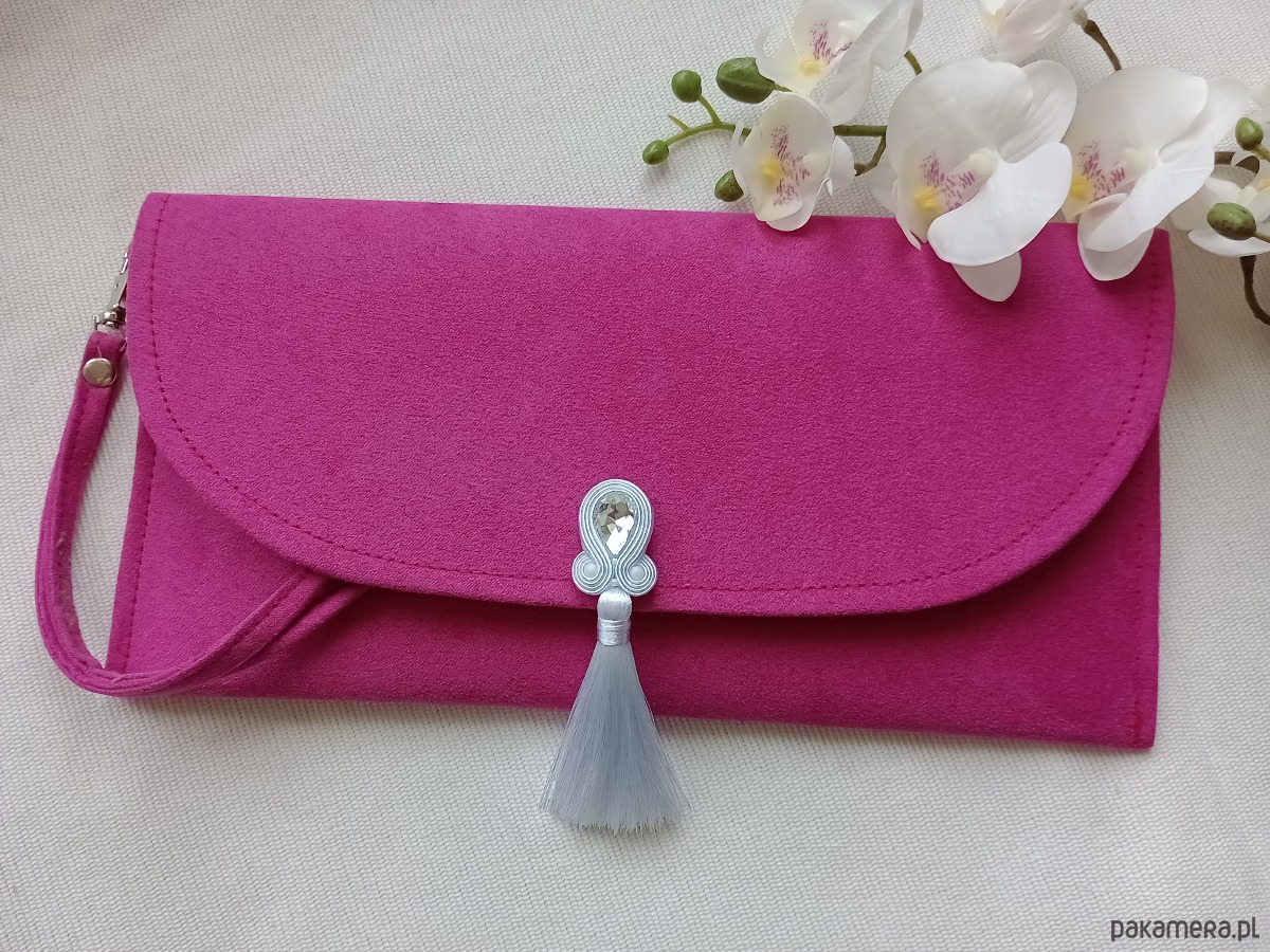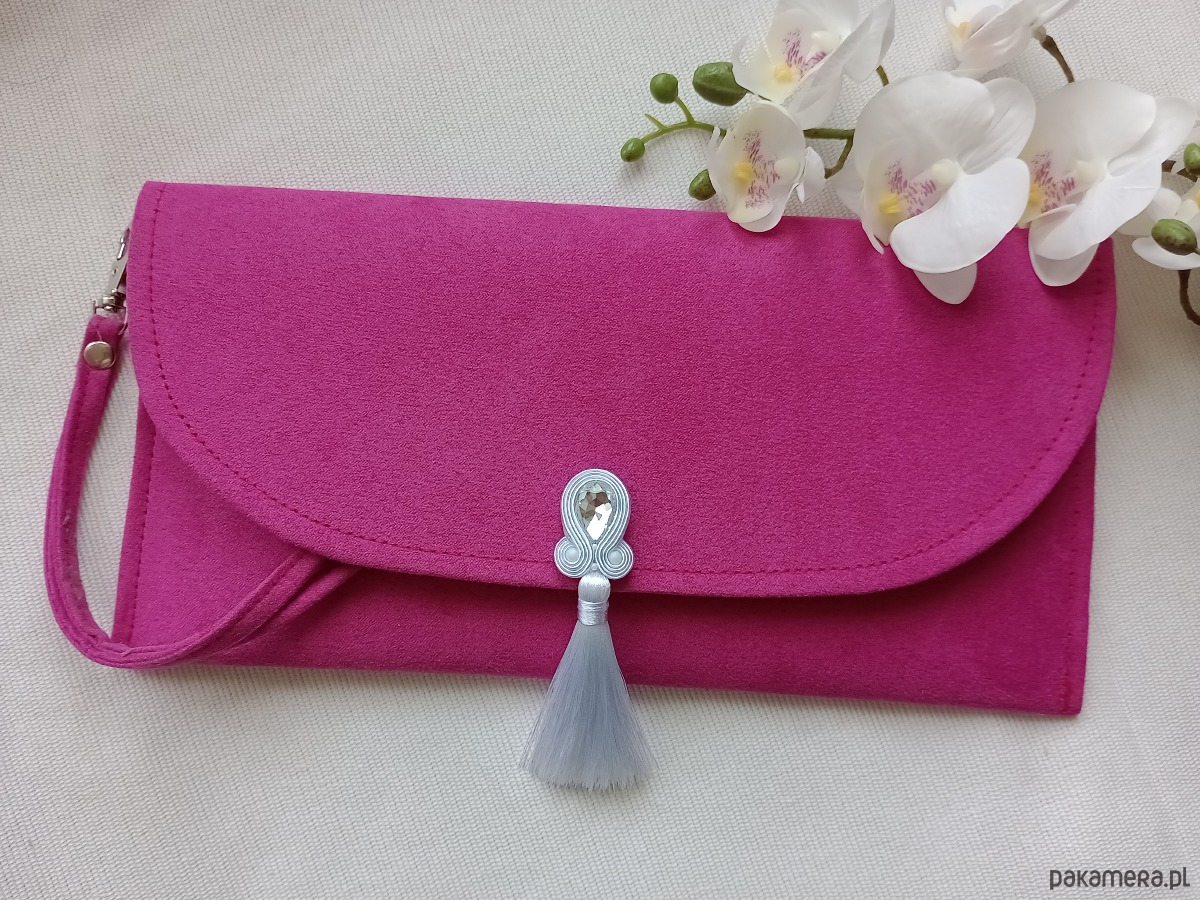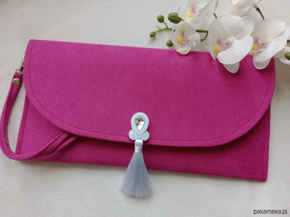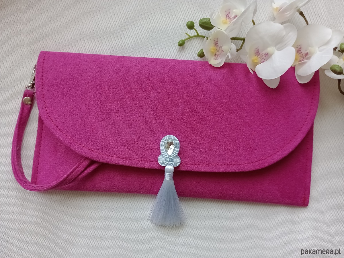 Torebka kopertówka z haftem soutache (sutasz). Różowa kopertówka, torebka do ręki fuksja, torebka na wesele, na przyjęcie, na komunię z białym kryształowym haftem.