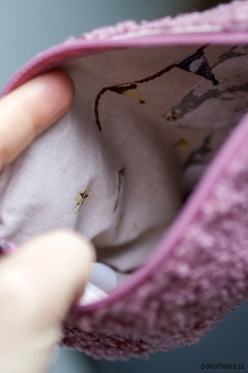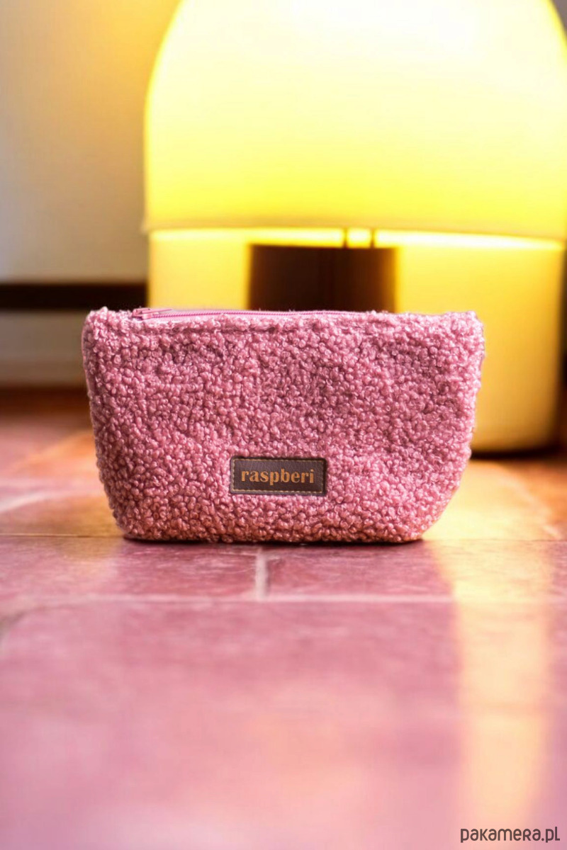 Średniej wielkości kosmetyczka wykonana z różowej bukli.