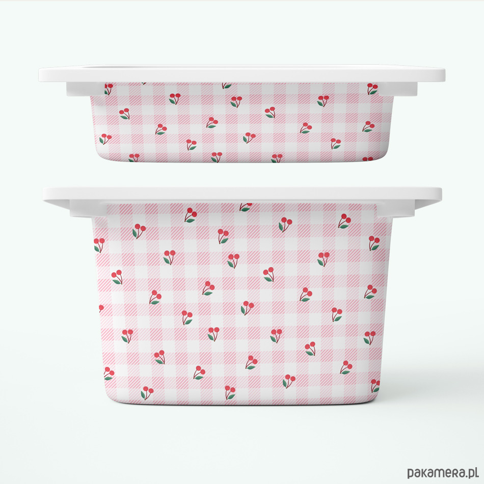 Różowa kratka i wisienki - naklejki na pojemniki na zabawki