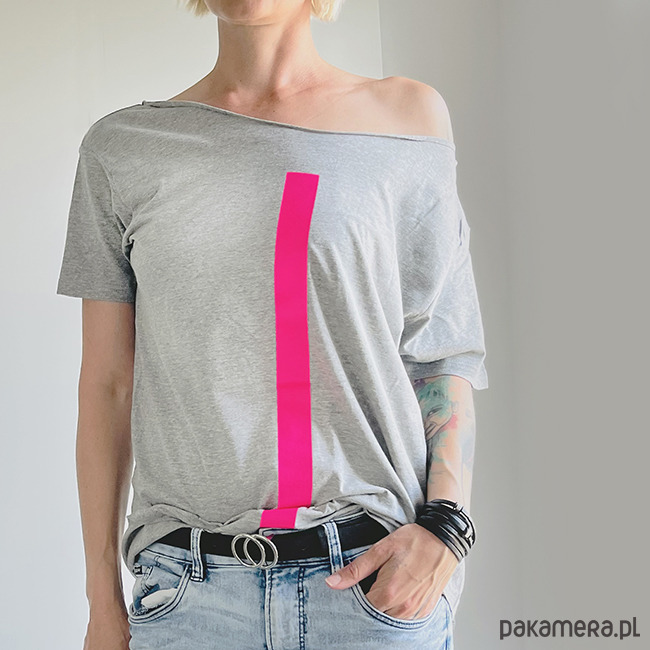 Wściekle różowa, neonowa kreska na średnio-szarym melanżu (nie bardzo jasny, ale też nie grafitowy).