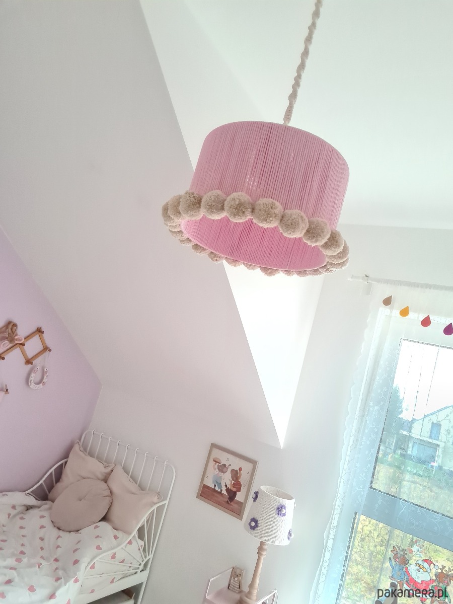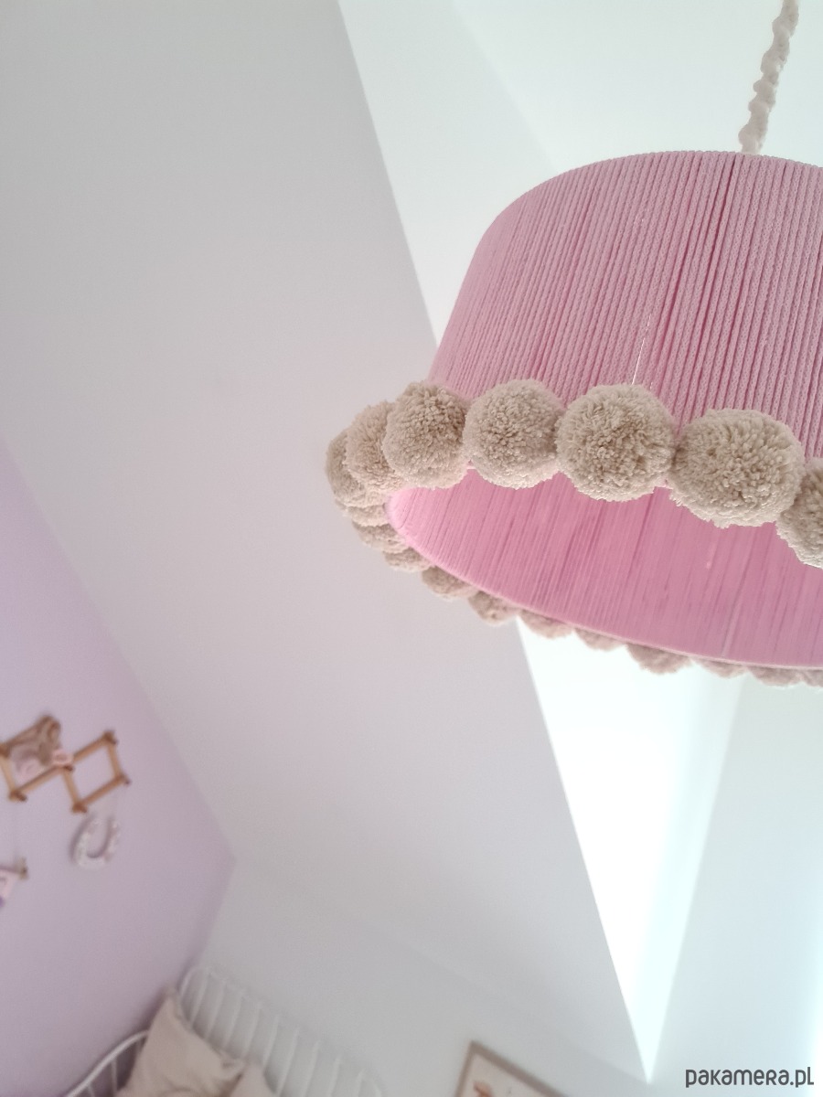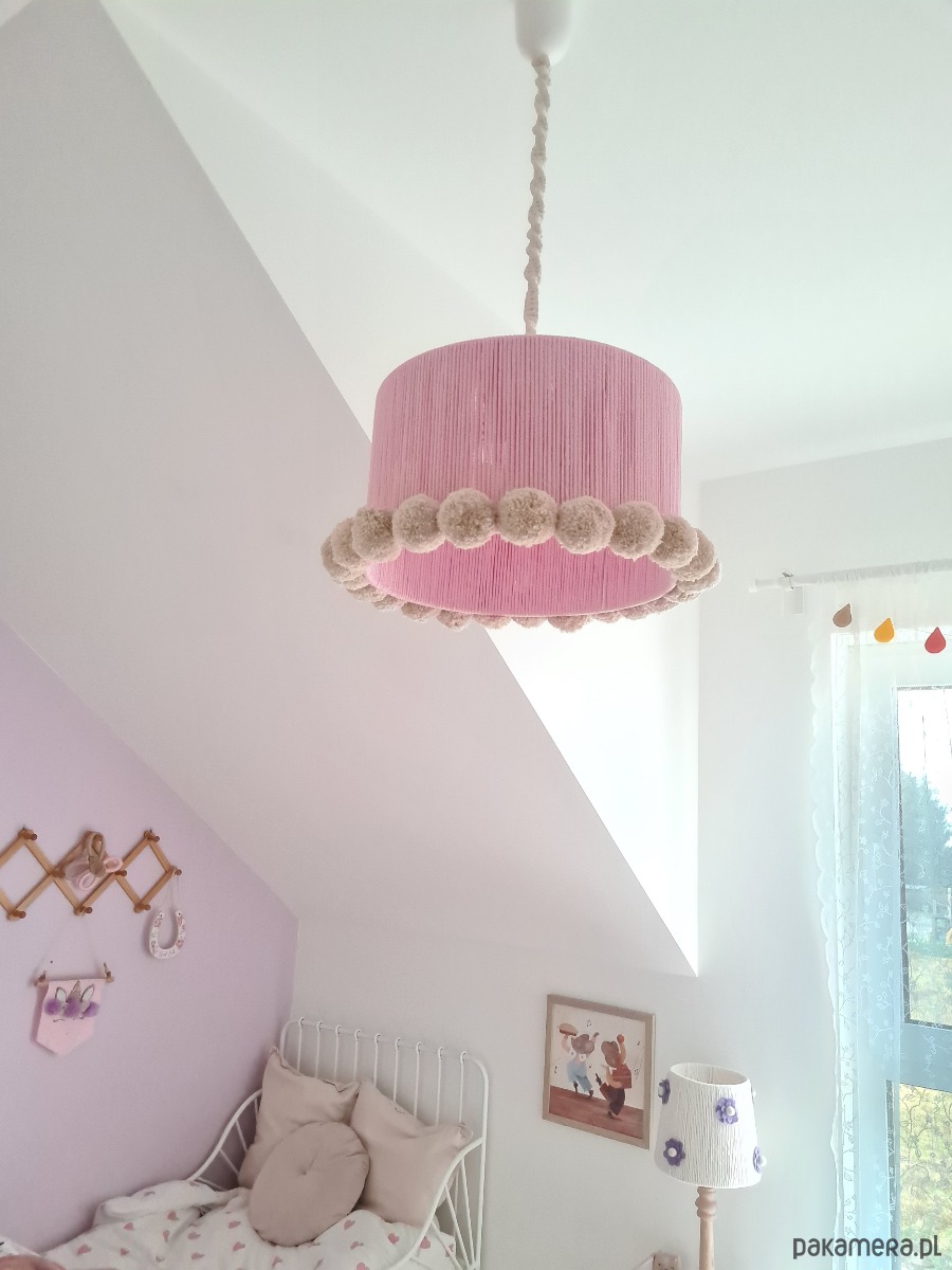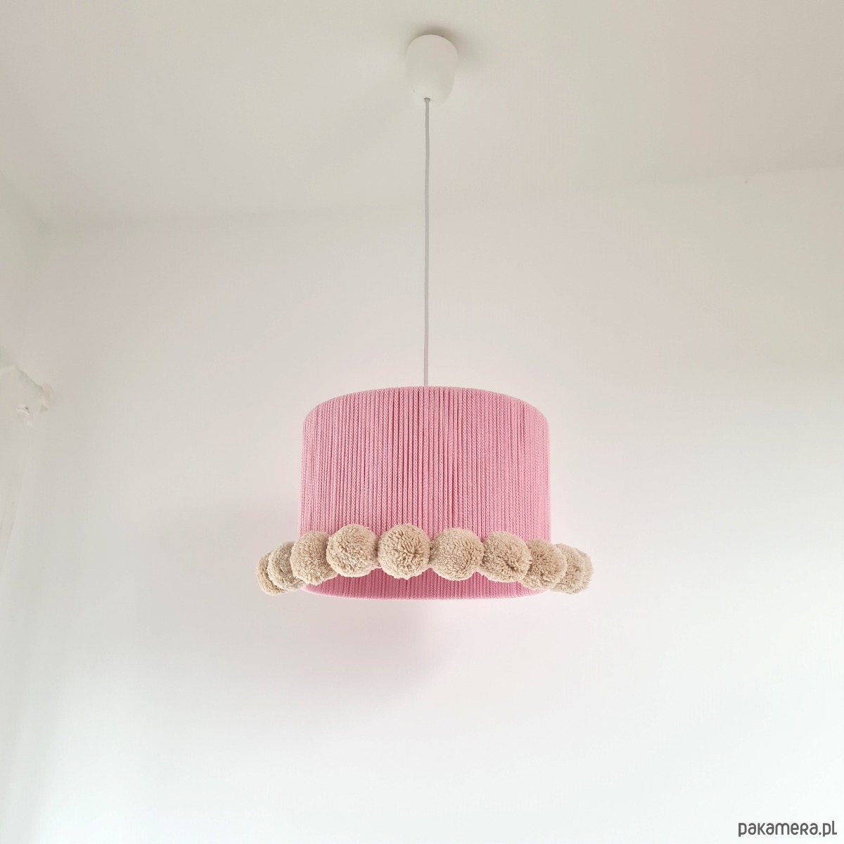 Różowa lampa sufitowa boho z beżowymi pomponami