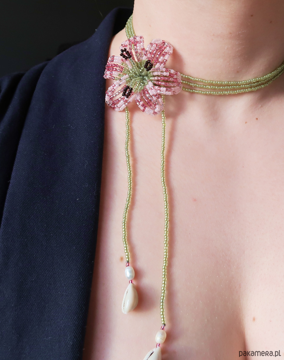 Noszenie: sznur koralików owiń wokół szyi i kwiatka (od tyłu)