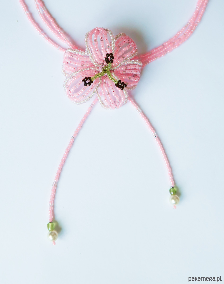Noszenie: sznur koralików owiń wokół szyi i kwiatka (od tyłu)