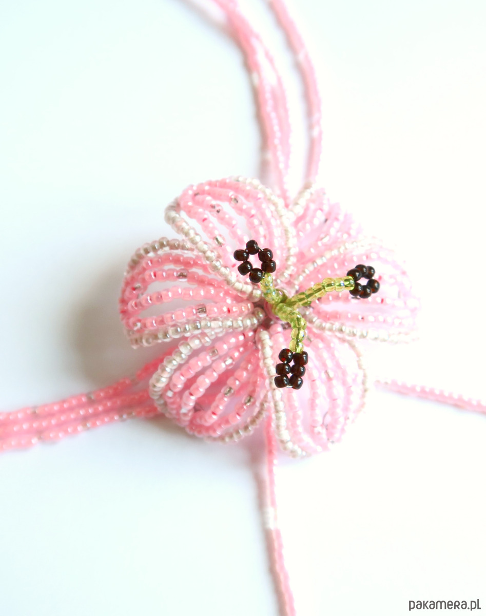 Kwiatek wykonany w technice french beaded, przymocowany do sznura koralików.