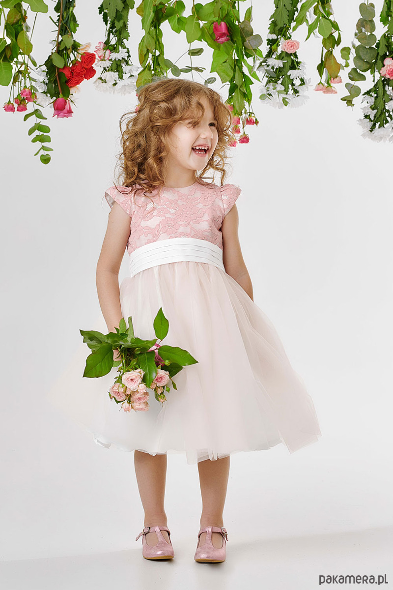 Wyjątkowa sukienka na wyjątkowe okazje dla małej księżniczki. Góra to koronka w kolorze różowym w kwiatowy wzór. Spód sukienki w kolorze ecru. Wiązaną szarfą z tyłu idealnie dopasujemy sukienkę do sylwetki. Efektowny tiulowy dół składa się z czterech warstw. Dwie warstwy to tiul, atłas, oraz lekka podszewka.