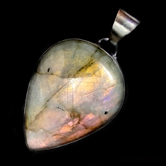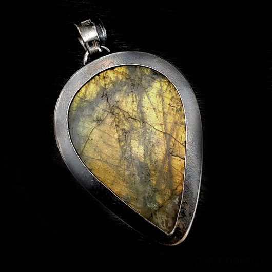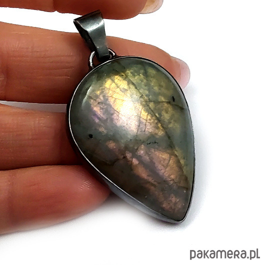 Okazały wisior z oprawionym w srebro próby 925 naturalnym labradorytem o zjawiskowej tafli intensywnych barw ukazujacych się pod odpowiednim kątem. Oprawa wykonana ręcznie, oksydowana. Pochodzenie kamienia: Madagaskar. Wymiary oprawy 42 x 30 mm, długosć z krawatką 54 mm. Waga wisiora 16,8 g. Tył wisiora otwarty. Wisior zostanie zapakowany w ozdobne pudełko.