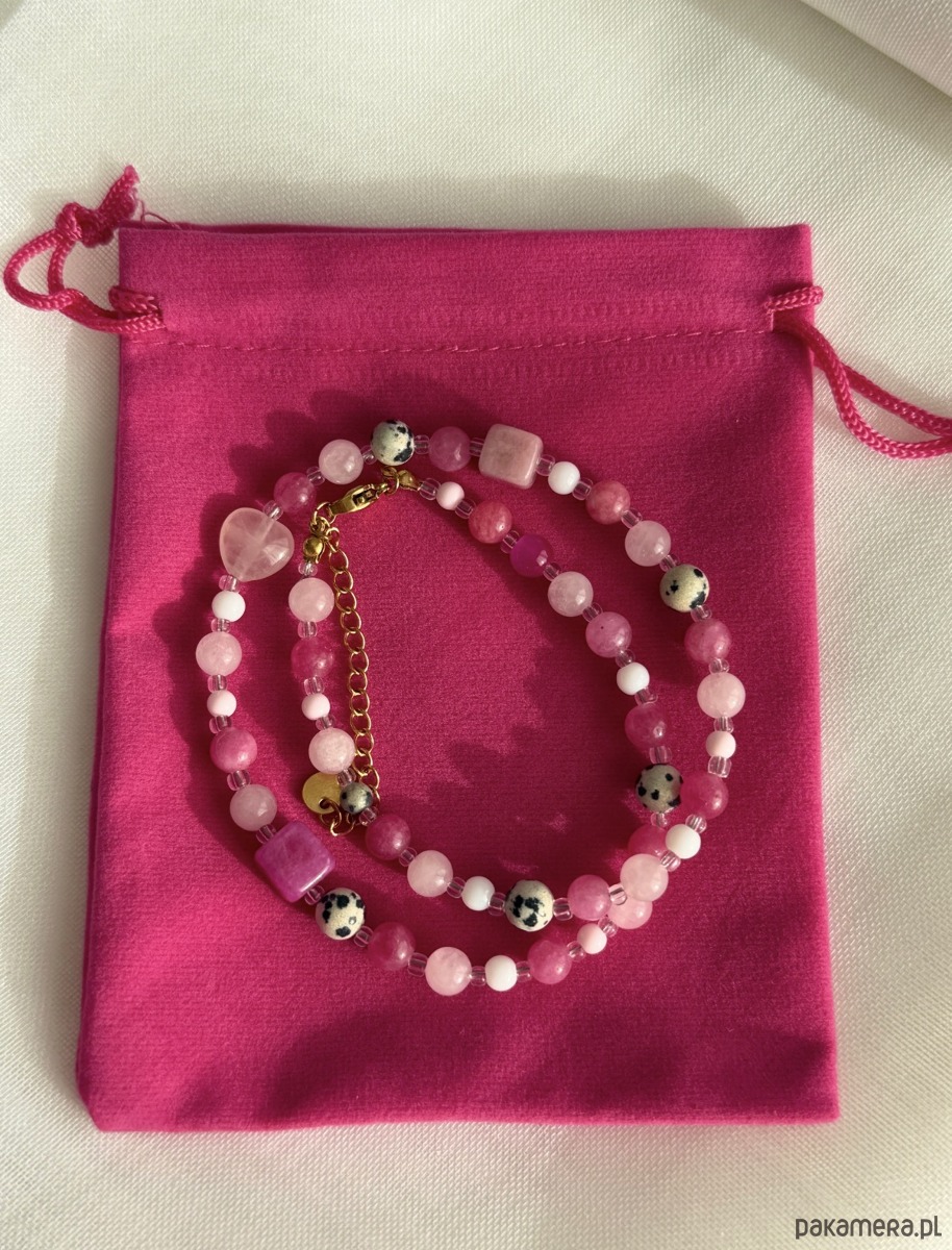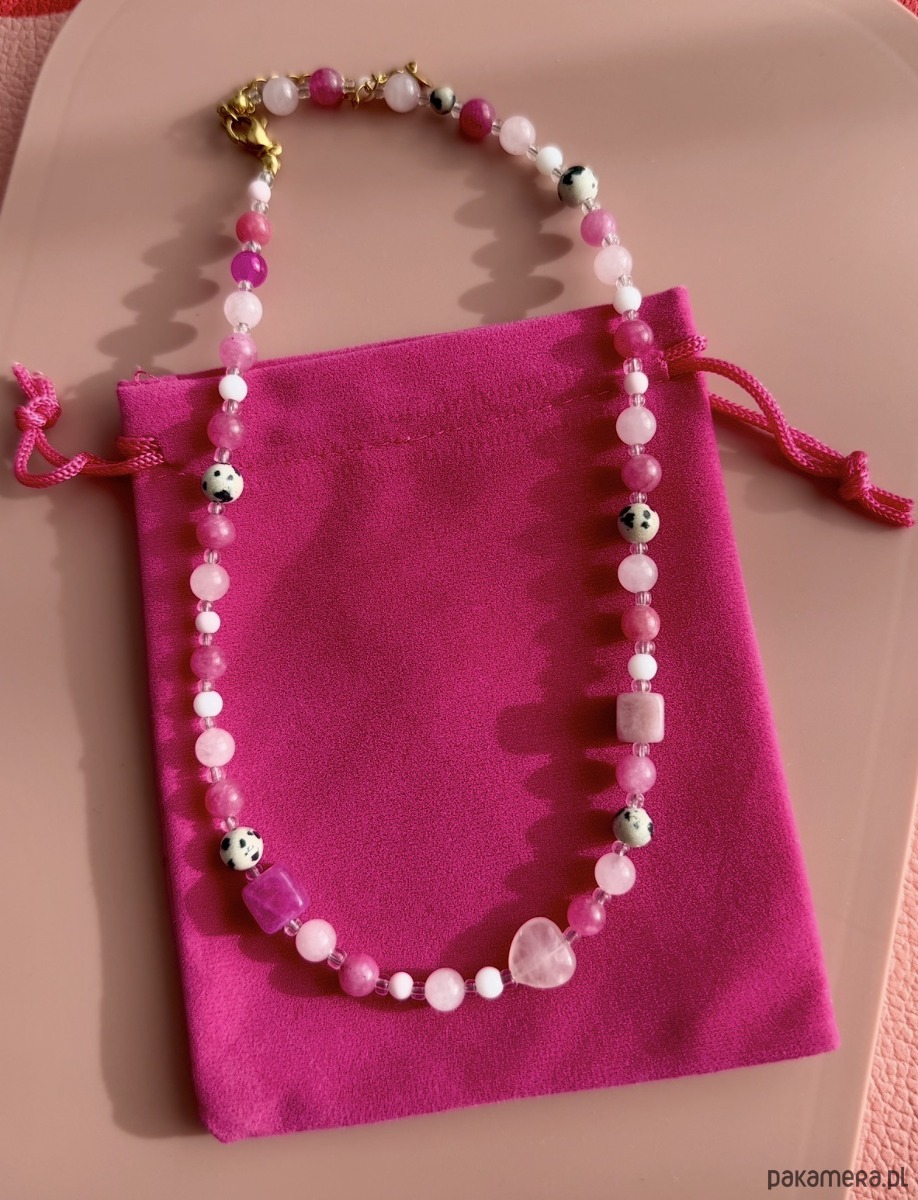 Naszyjnik z naturalnych kamieni w odcieniach różowego, przeplatanych przezroczystymi koralikami.