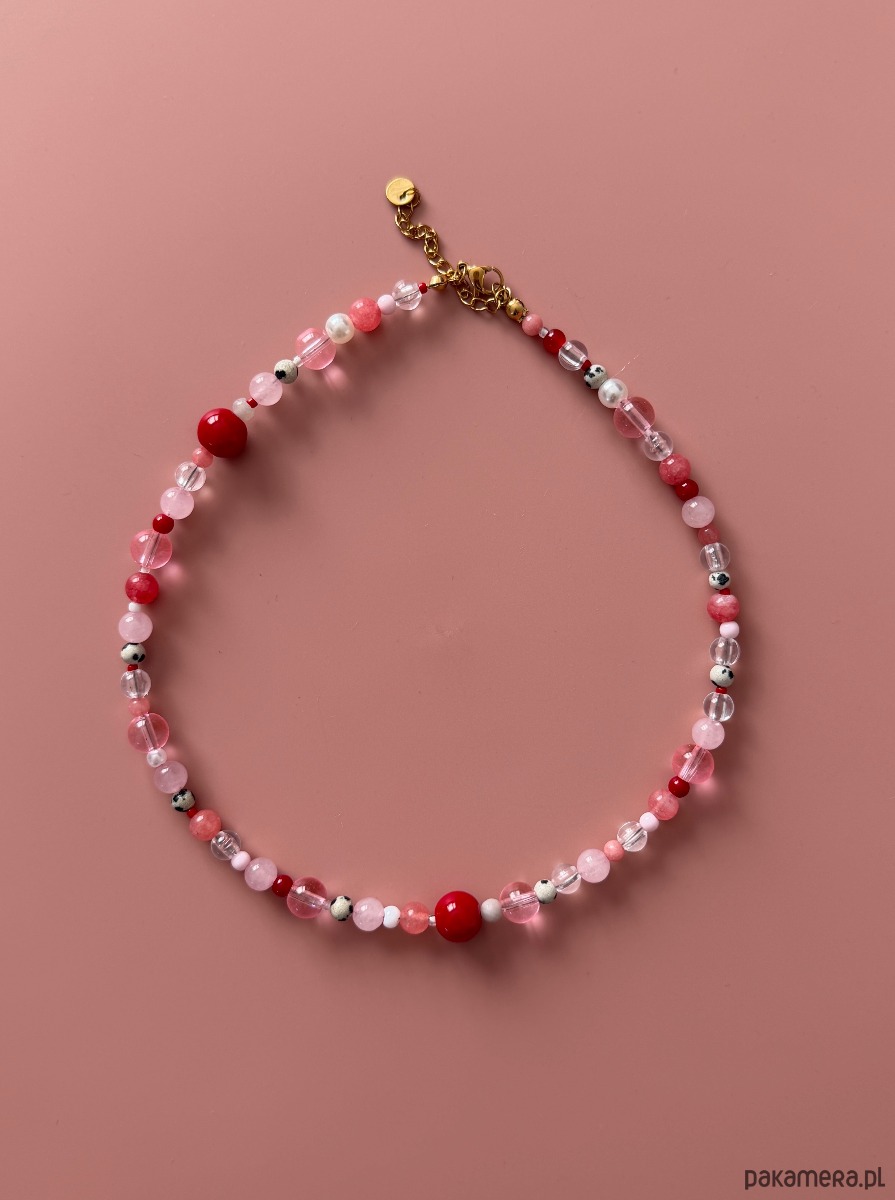 Naszyjnik z kolorowych kamieni i koralików w odcieniach różowego i czerwonego.