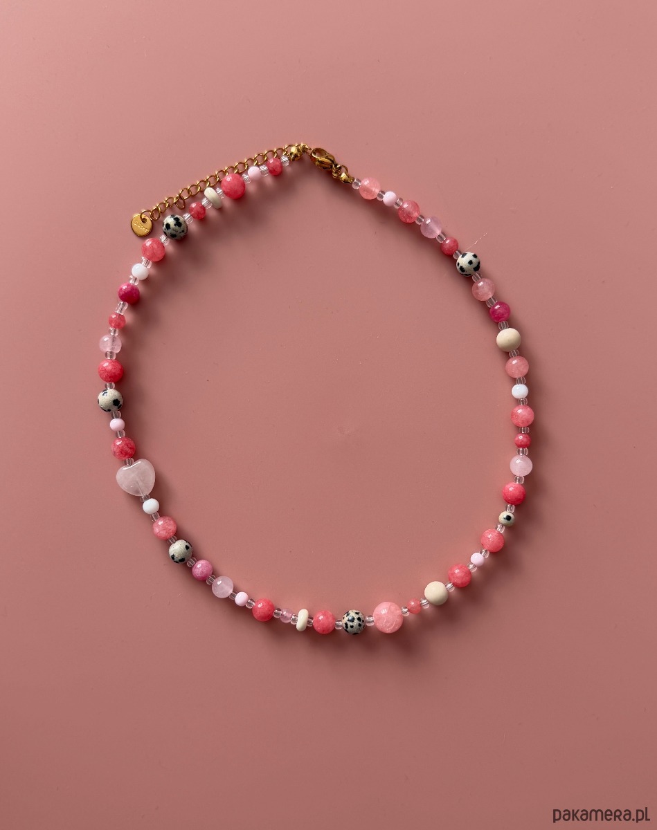Naszyjnik z kolorowych kamieni i koralików w odcieniach różowego.