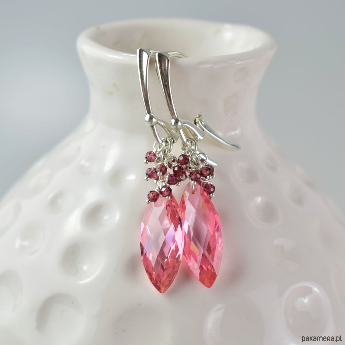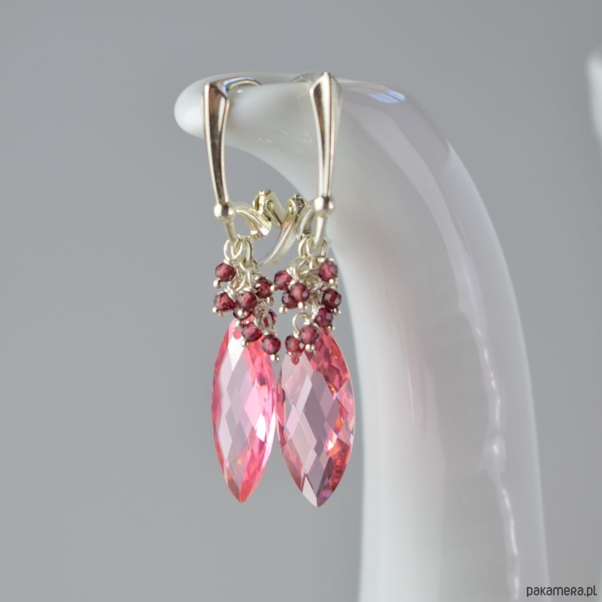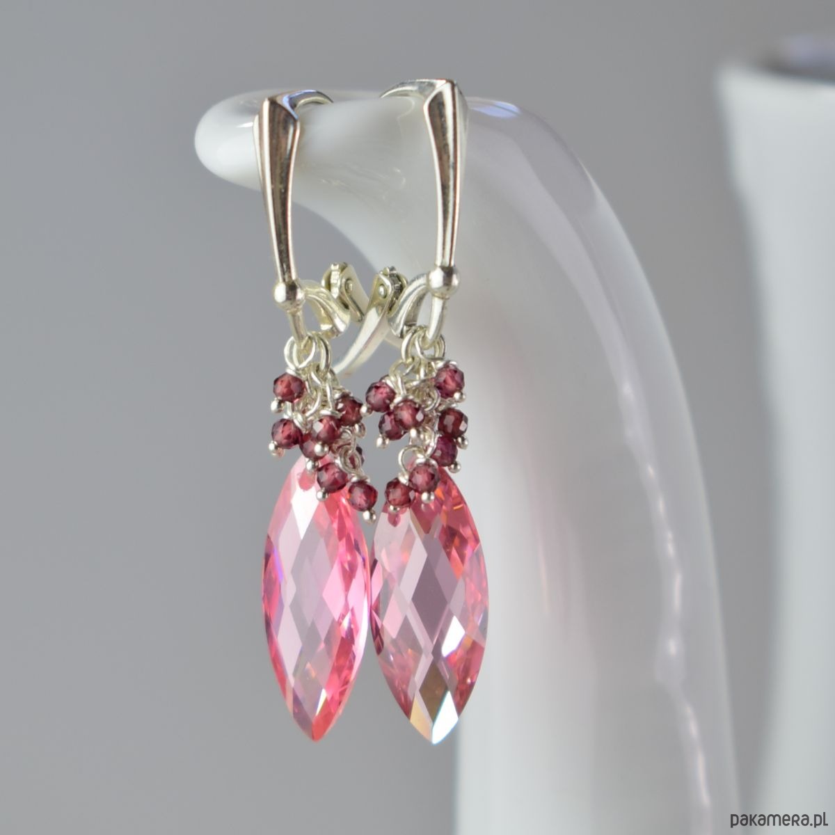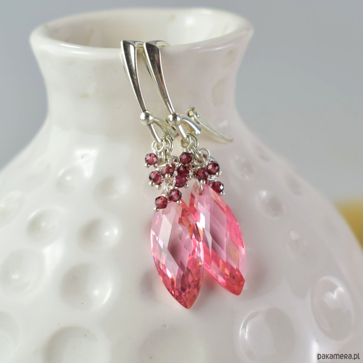 Różowe cyrkonie z granatem - srebrne kolczyki