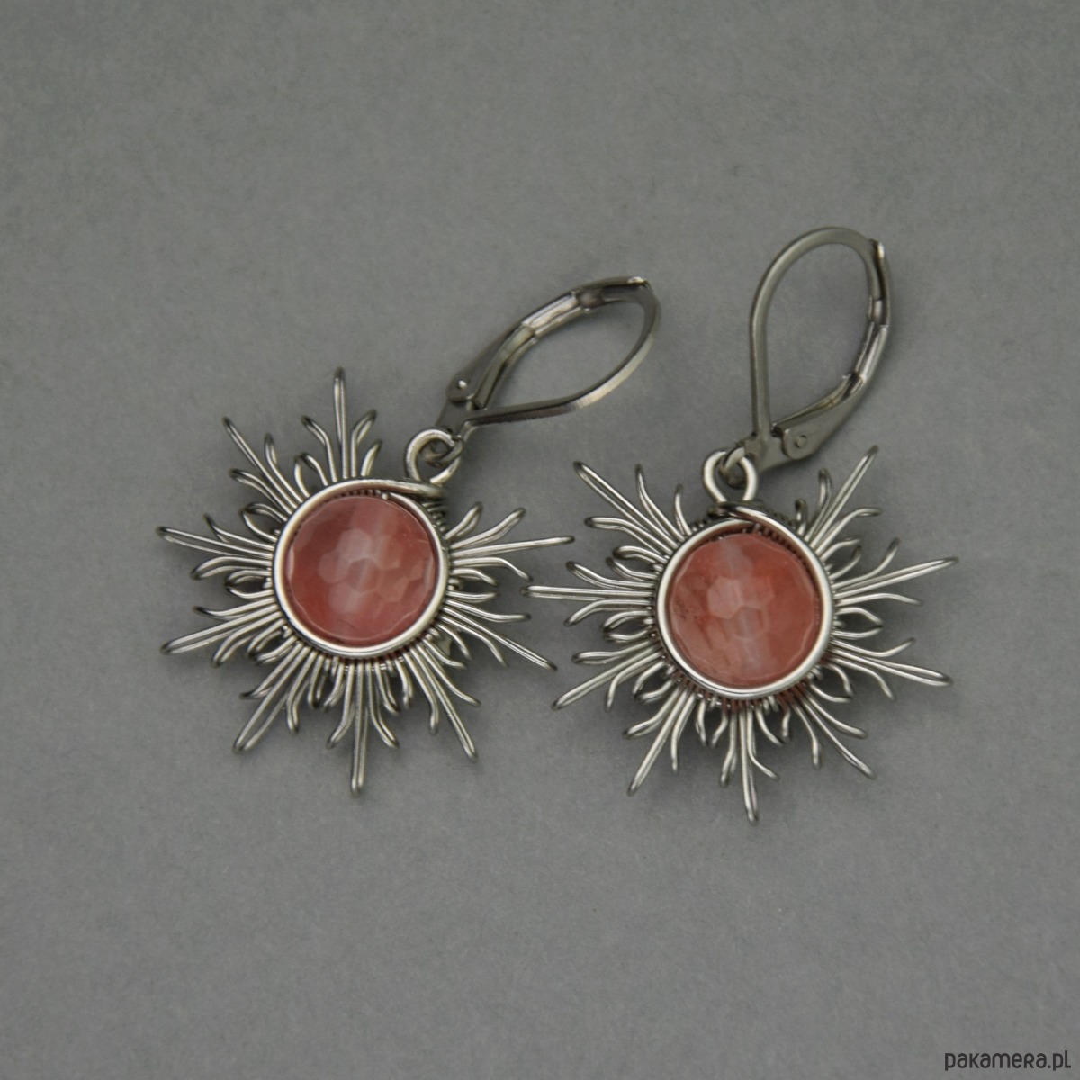 Różowe kolczyki słońce kwarc malinowy wire wrapping słoneczka