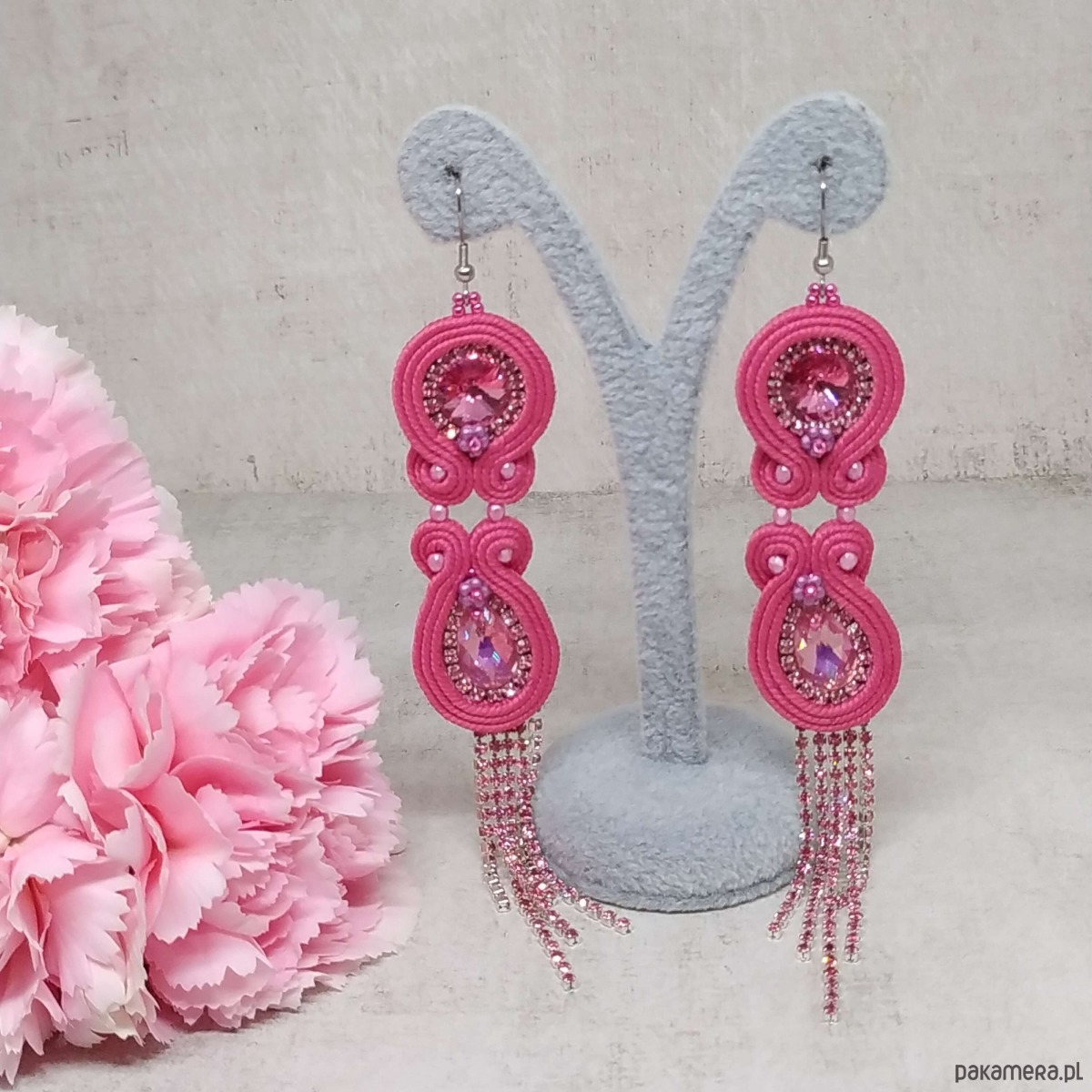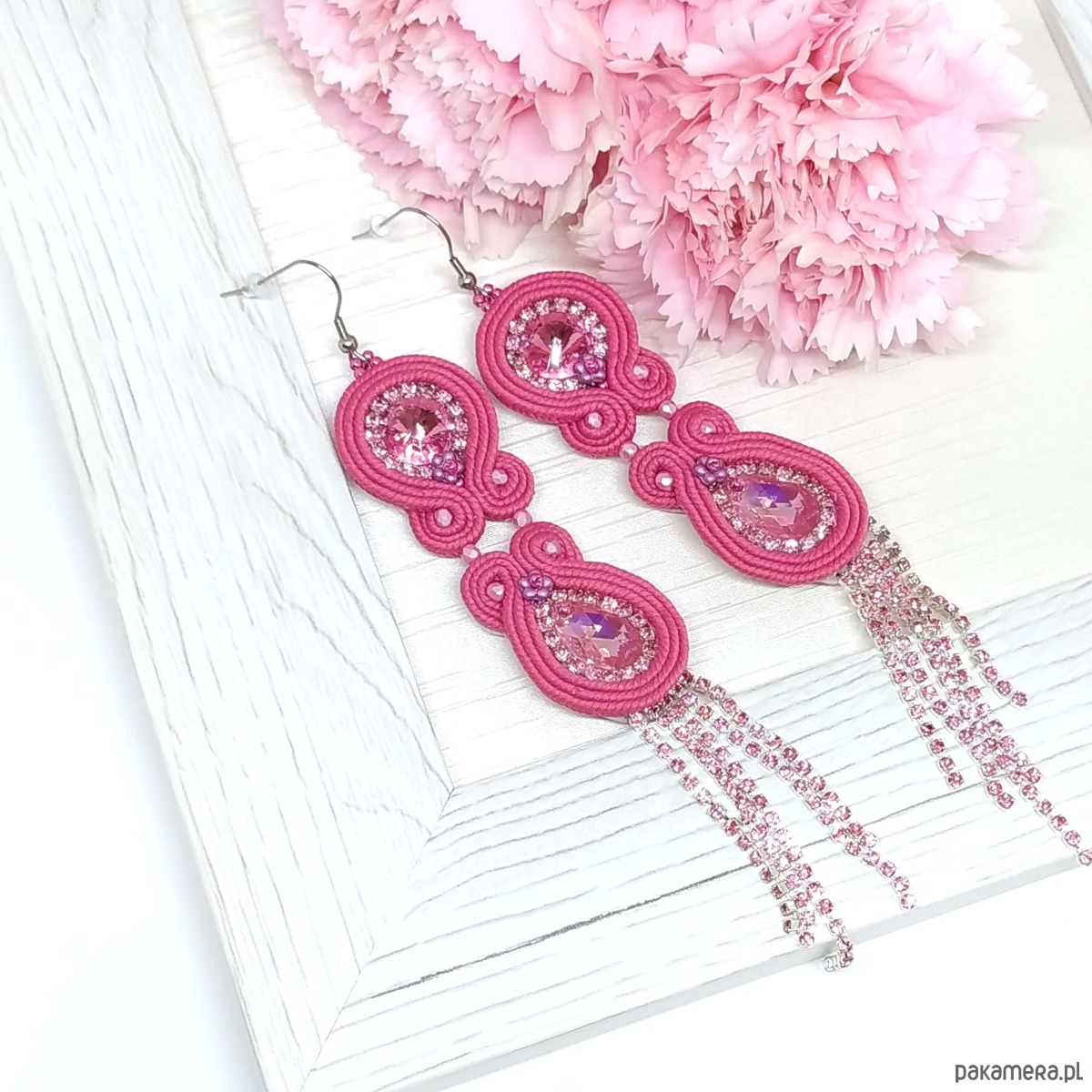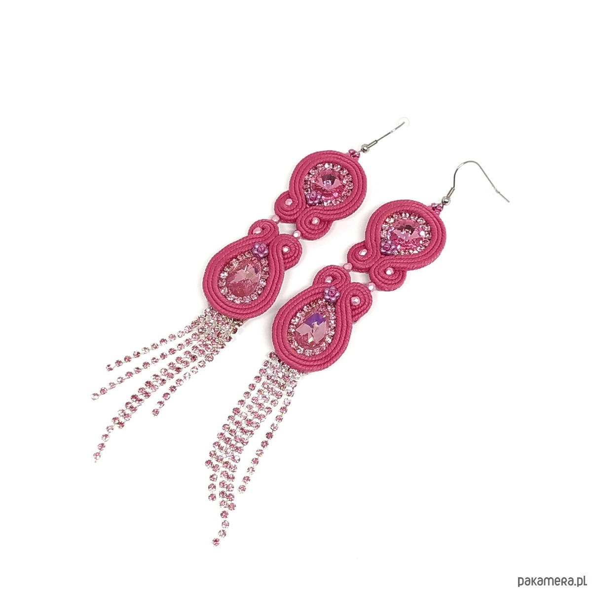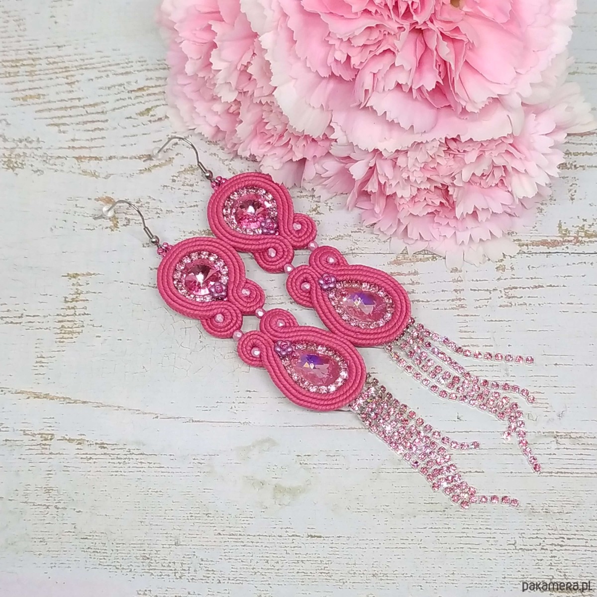 Te pełne blasku kolczyki są roziskrzone, lśniące i bardzo, ale to bardzo kobiece. Można powiedzieć, że to odrobina blasku zamknięta w kryształkach. Są idealne do wszelkich stylizacji w stylu glamour. Lśniące kryształy w kolorze różowym i delikatne kaskady maleńkich kryształków tworzą uroczą kombinację połączoną pasmami sutaszu w kolorze różowym.