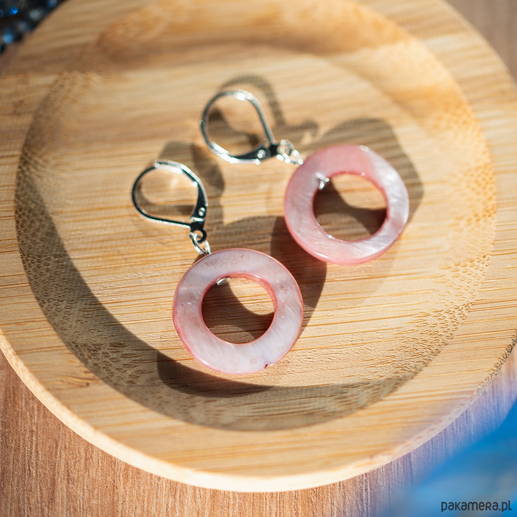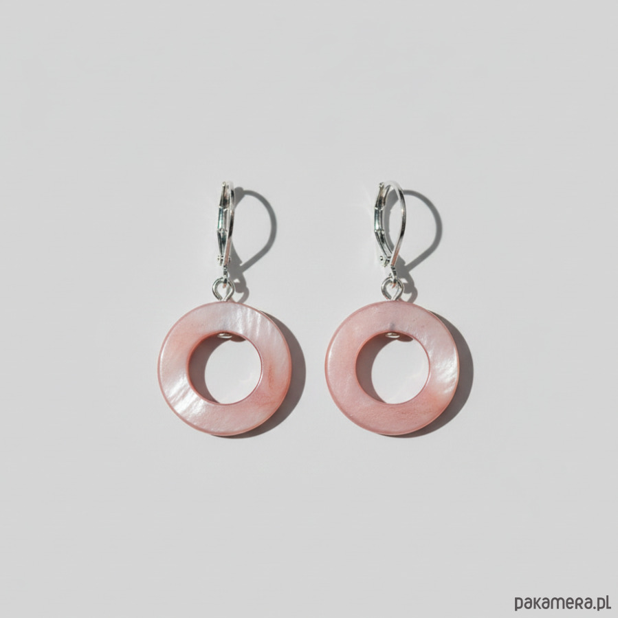 Różowe kolczyki z masy perłowej w kształcie koła. Minimalistyczne i delikatne, dodają subtelnego blasku i pasują do wielu stylizacji – od codziennych po eleganckie.