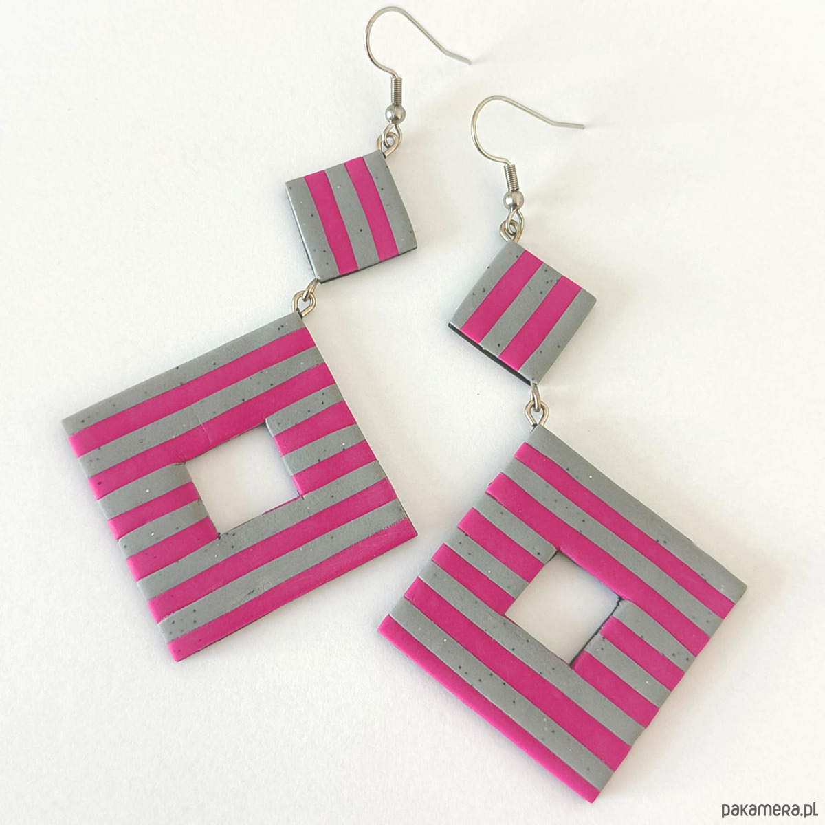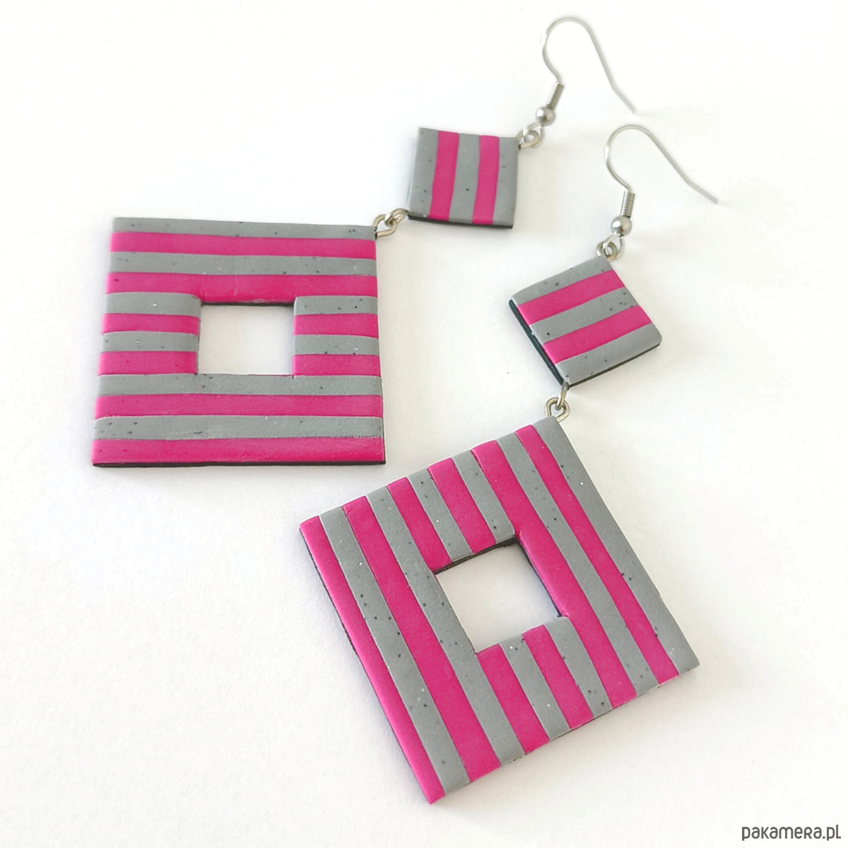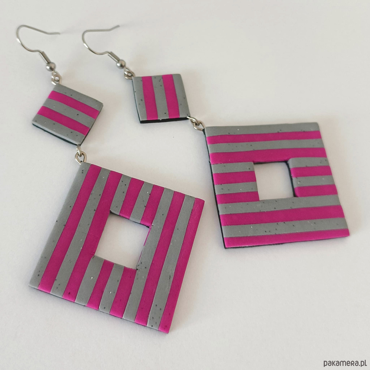 Ręcznie robione kolczyki w szaro różowe paski to odważna i nowoczesna propozycja dla osób, które kochają wyraziste dodatki. Geometryczna forma i lekkość masy termoutwardzalnej sprawiają, że są wygodne w noszeniu, a jednocześnie przyciągają wzrok. Idealne na prezent lub do urozmaicenia codziennej stylizacji.