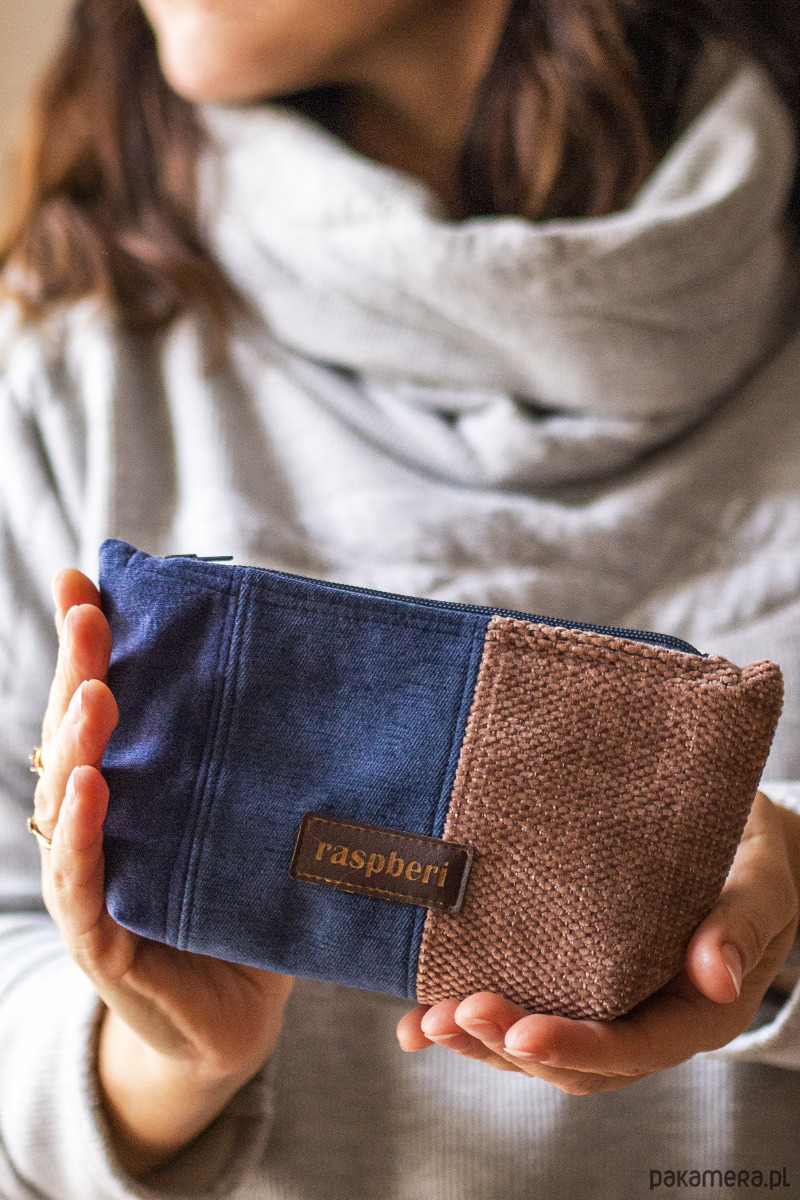 Średniej wielkości kosmetyczka wykonana z kilku rodzajów tkanin w kolorze różowym oraz granatowym.