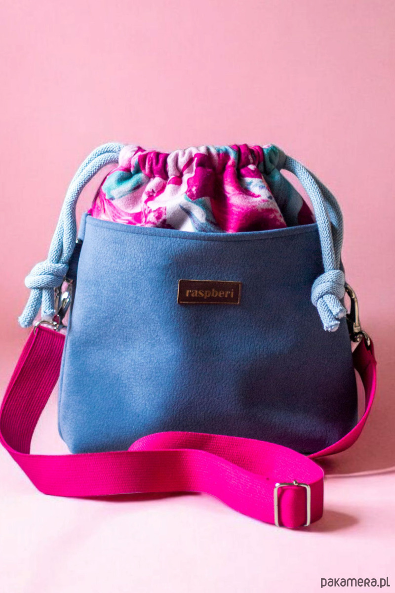 Wykonana z tkaniny w kolorze różowym. Z przodu oraz z na tyle torebki kieszenie (np. na telefon czy chusteczki) z niebieskiej tkaniny typu zamsz. Stworzona w duchu no waste. W środku kieszonka zapinana na suwak.