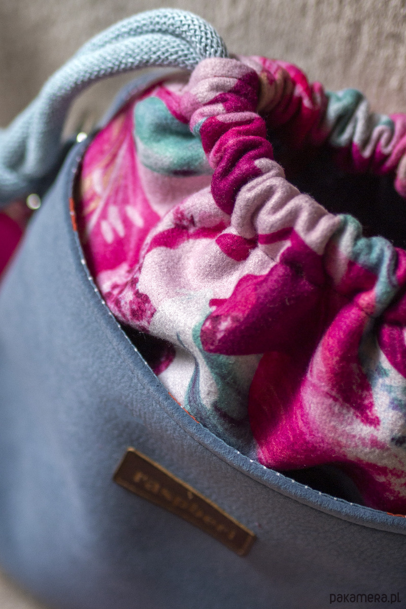 Całość ściągana grubym, bawełnianym sznurkiem w kolorze błękitnym.