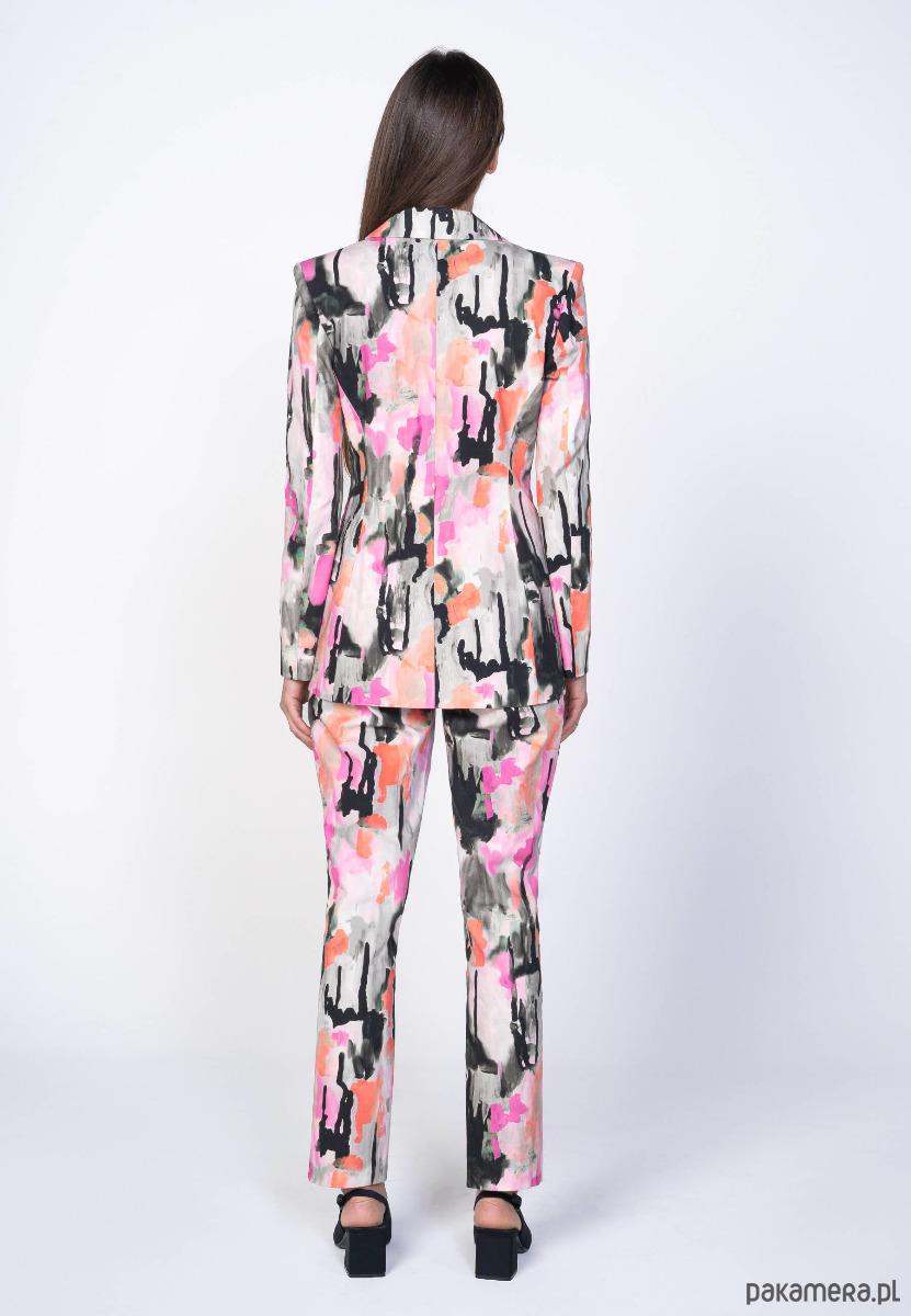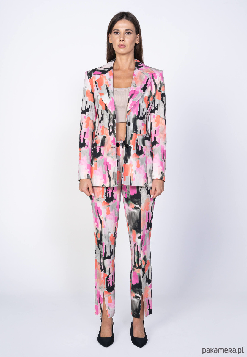 W skład zestawu wchodzi zapinana na 2 guziczki marynarka oraz spodnie z rozcięciem na dole zapinane na zamek błyskawiczny.
