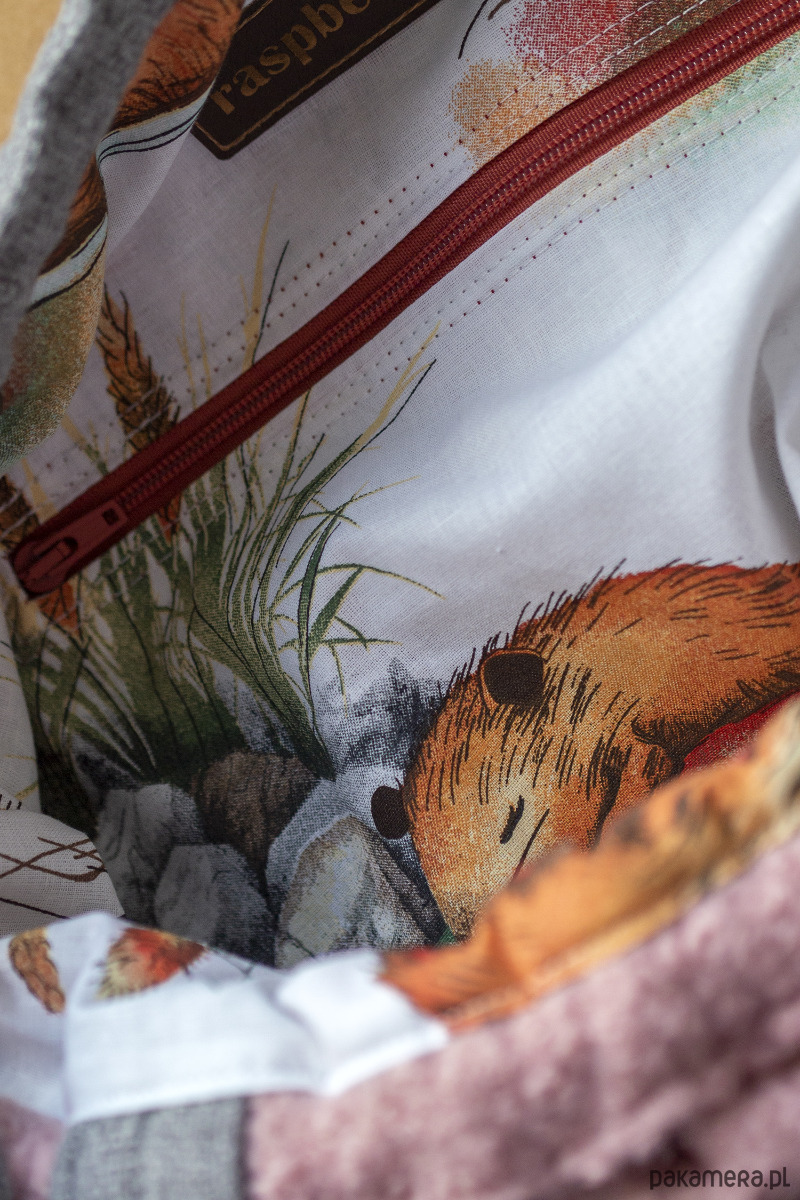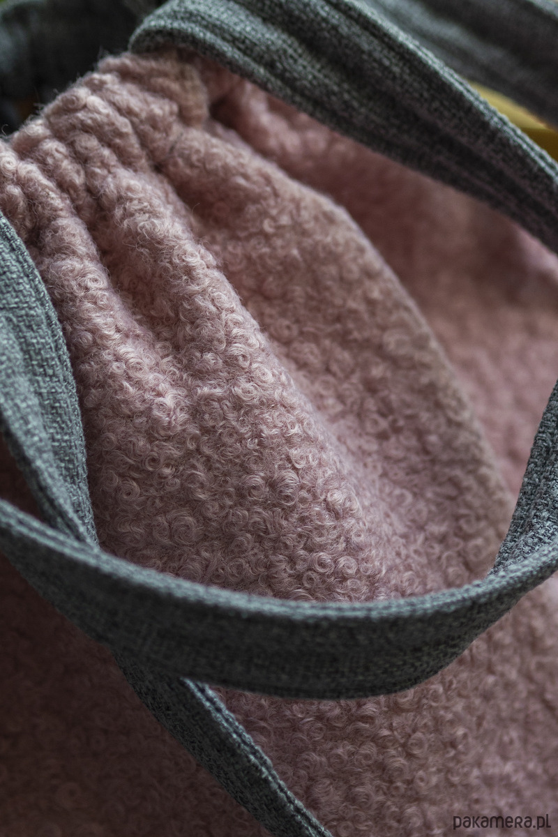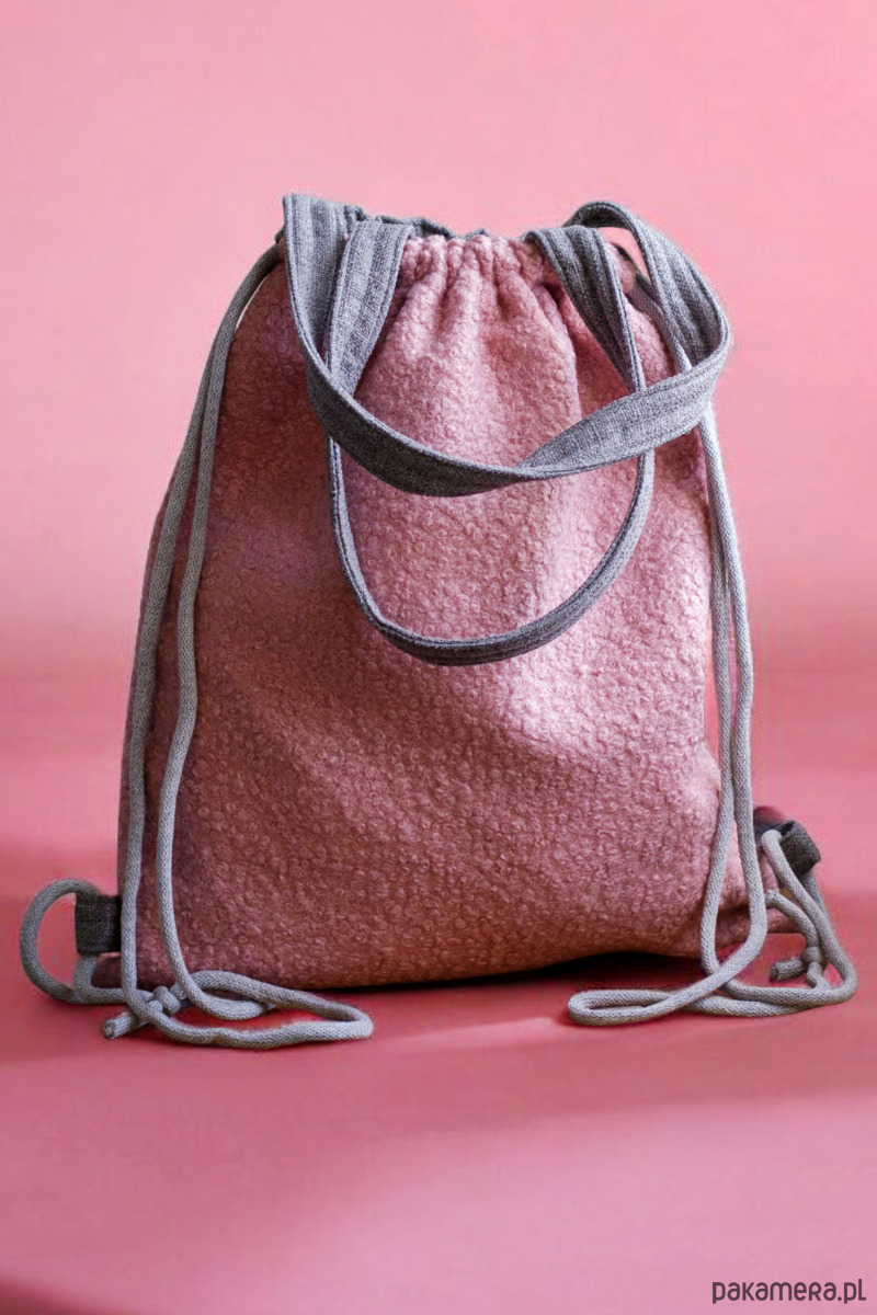 Plecakotorba worek 2w1 wykonana z tkaniny typu baranek w kolorze różowym w połączeniu z szarym welurem.