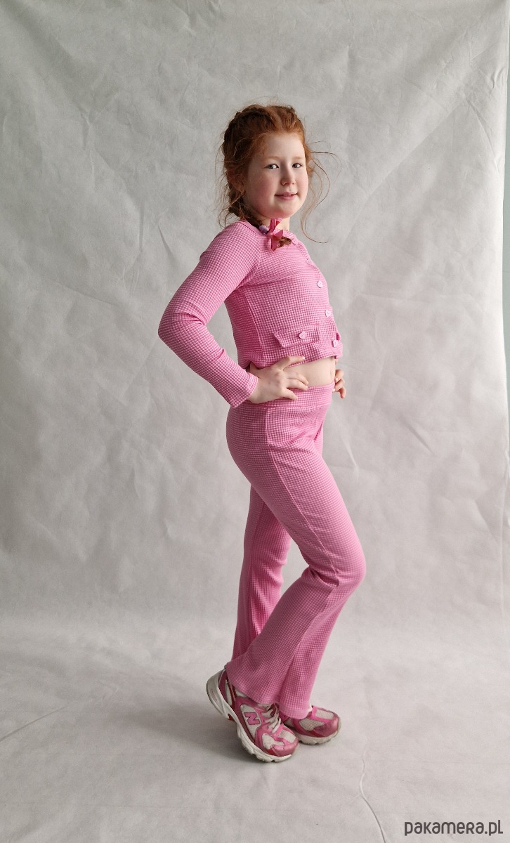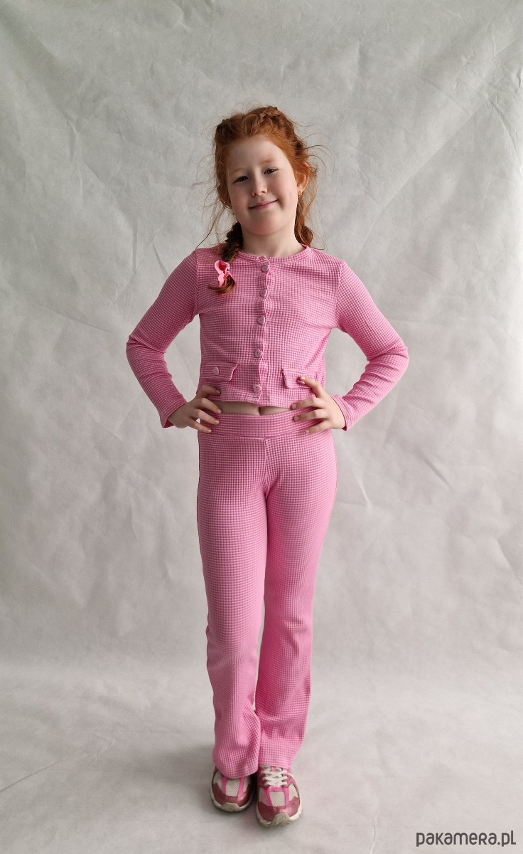 Kardigan zapinany jest na guziczki serduszka, ma długi rękaw i dwie imitacje kieszonek. Spodnie natomiast mają fason flare, czyli rozszerzają się od kolana, w pasie mają szeroką gumkę