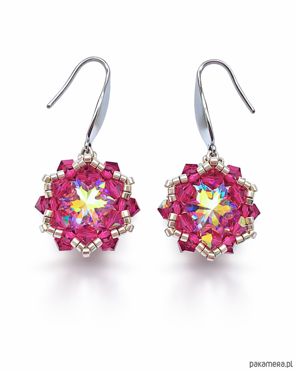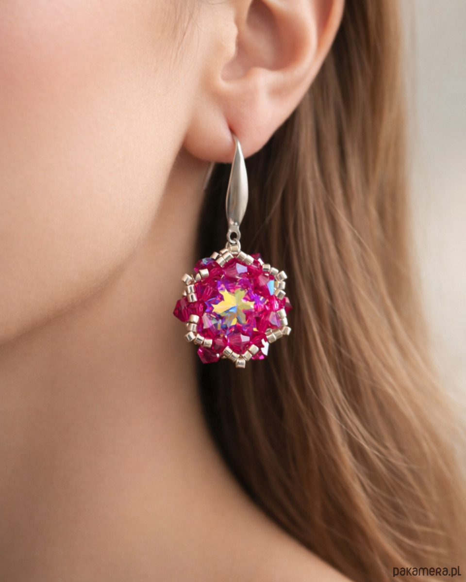 Zestaw Crystal Maxima - Fuchsia składa się z kolczyków oraz naszyjnika, tworzących spójną, harmonijną całość. Centralnym punktem biżuterii są kamienie Preciosa Rivoli Maxima w kolorze Crystal AB, otulone misterną oprawą z drobnych koralików Miyuki Delica oraz kryształków Preciosa Bicone w odcieniu Fuchsia. Ręczne tkanie pozwala uzyskać lekką, a jednocześnie trwałą konstrukcję, w której każdy detal ma znaczenie.
