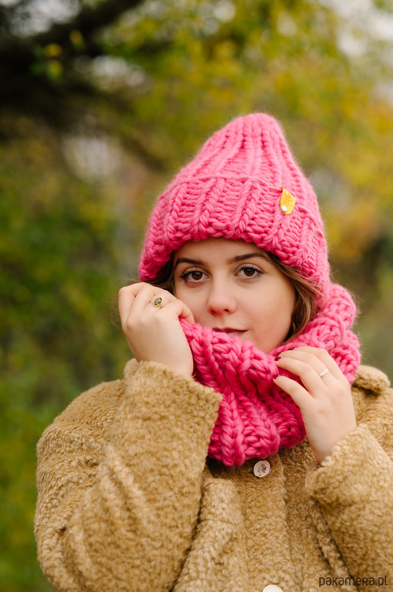 Różowy komplet zimowy: 100% wełna czapka wełniana i komin
