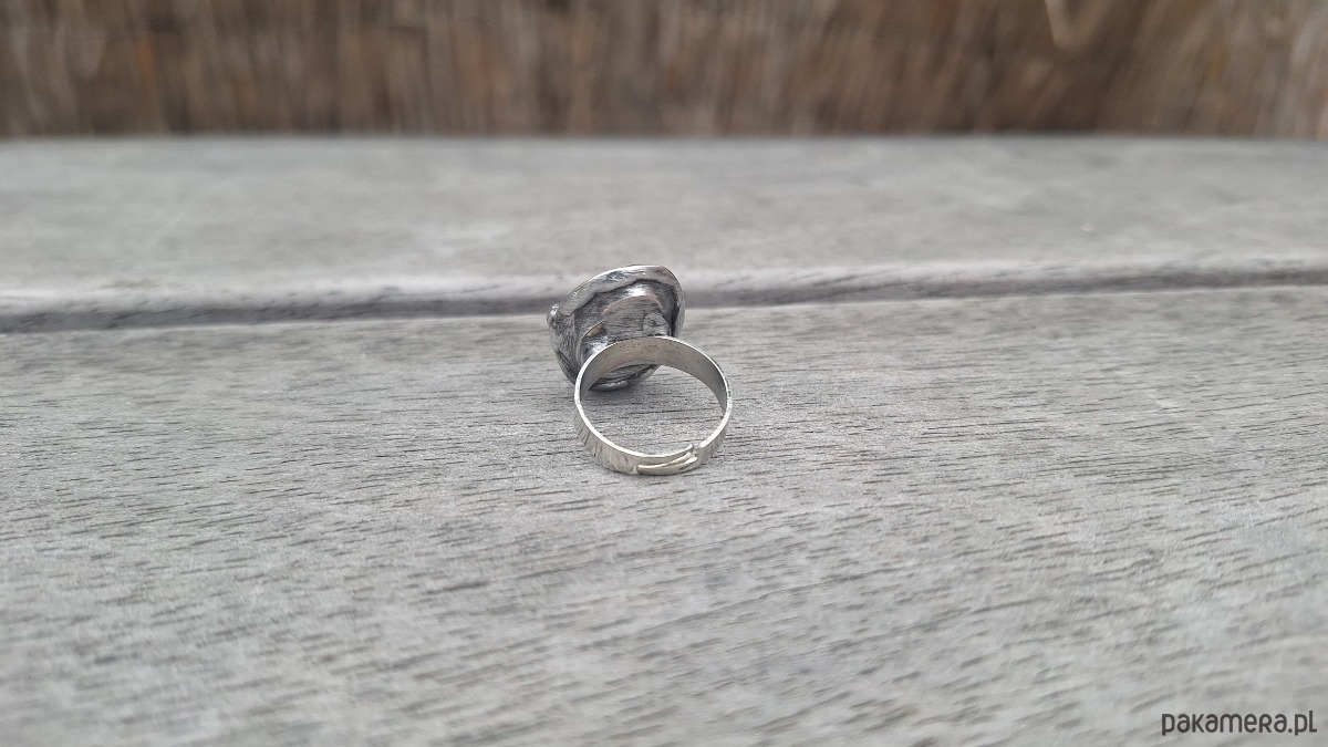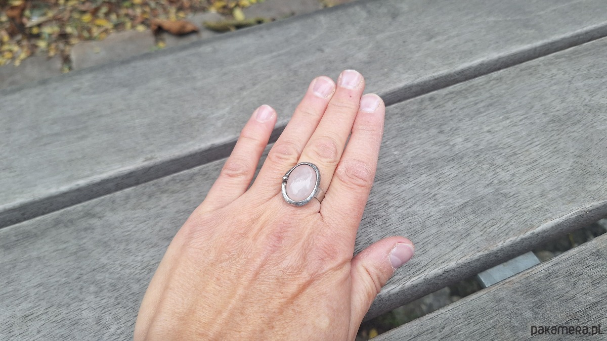 Pierścionek wykonany z miedzi, cyny i różowego kwarcu. Wymiary ok. 2 na 1.5 cm. Regulowany. Nie jest ciężki.