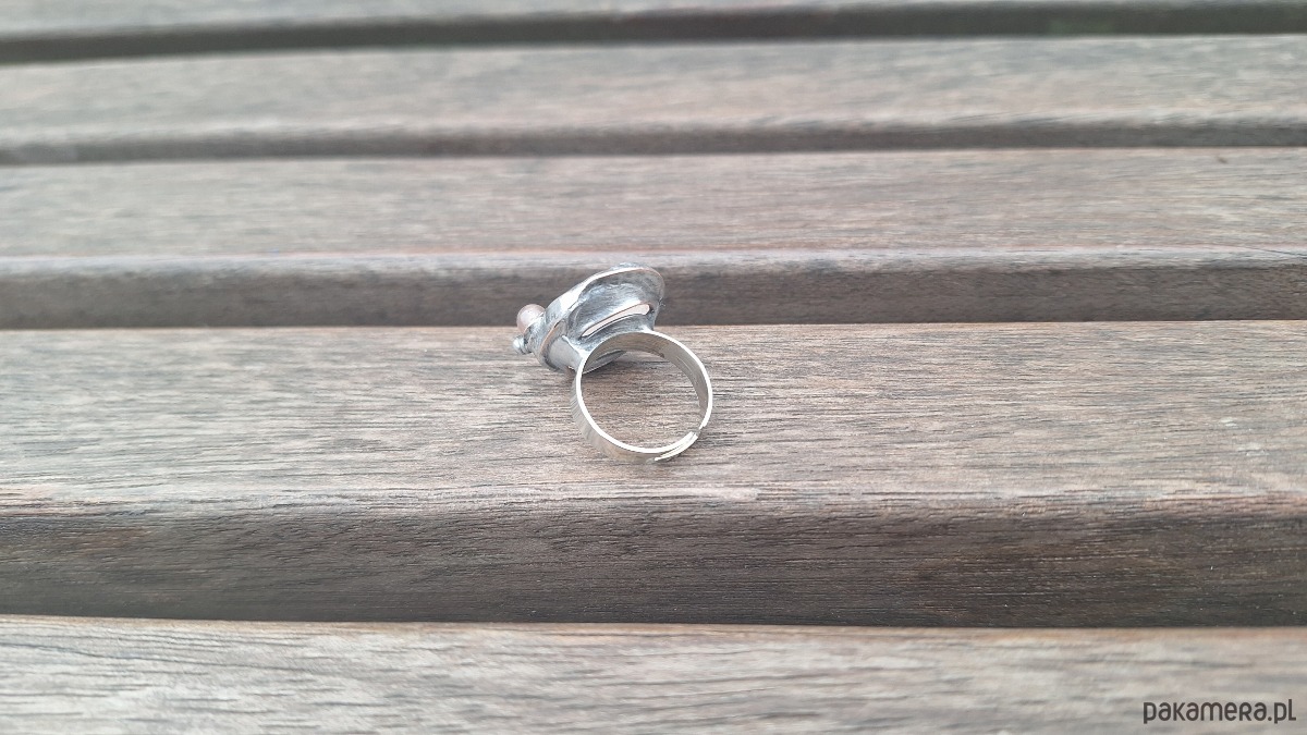 Pierścionek wykonany z miedzi, cyny, turmalinu i różowego kwarcu. Wymiary ok. 2 na 1.5 cm. Regulowany. Nie jest ciężki.