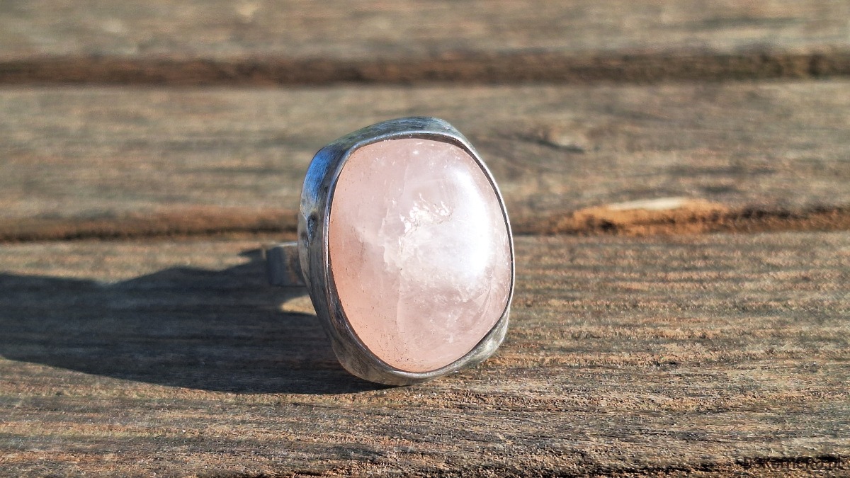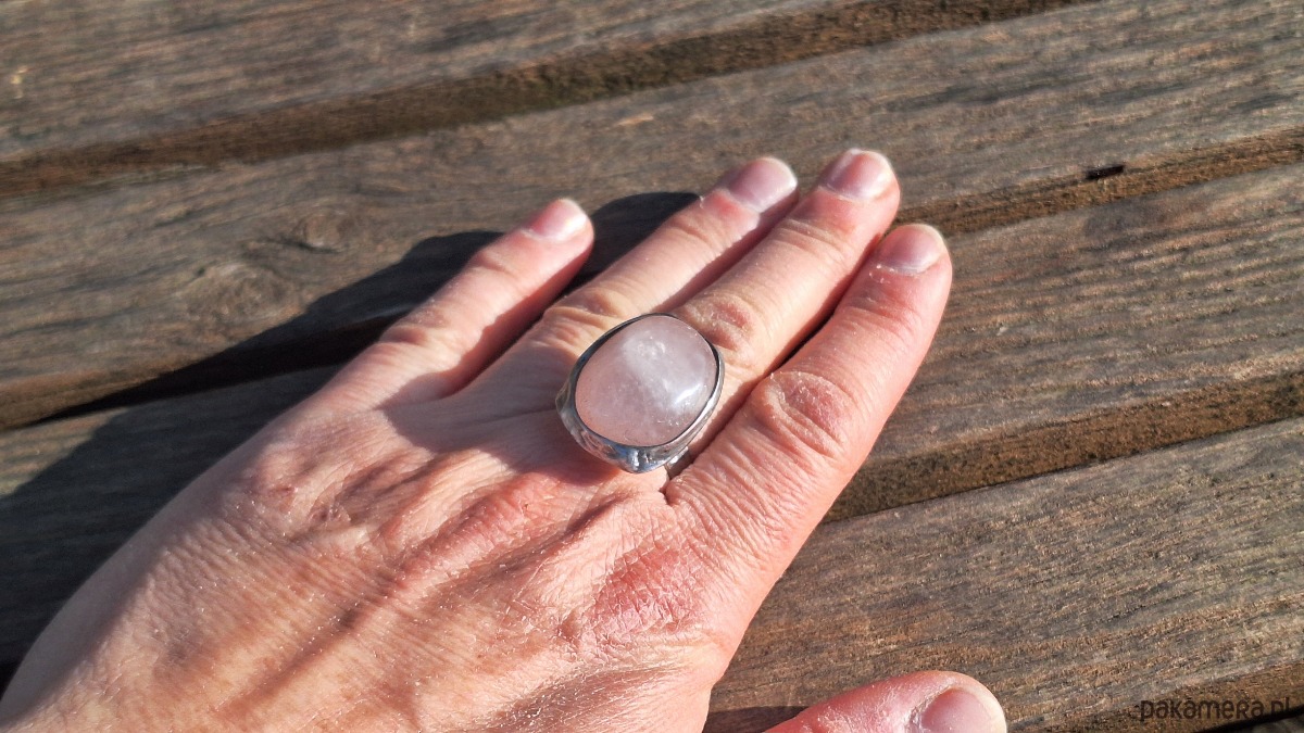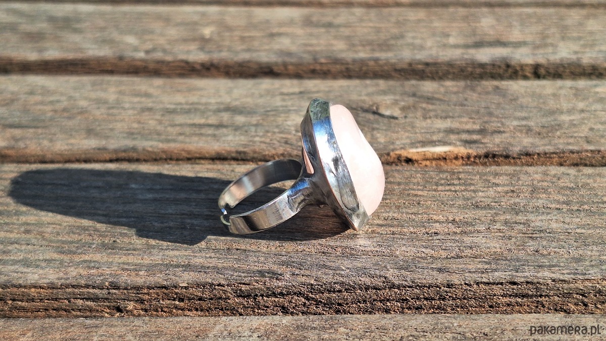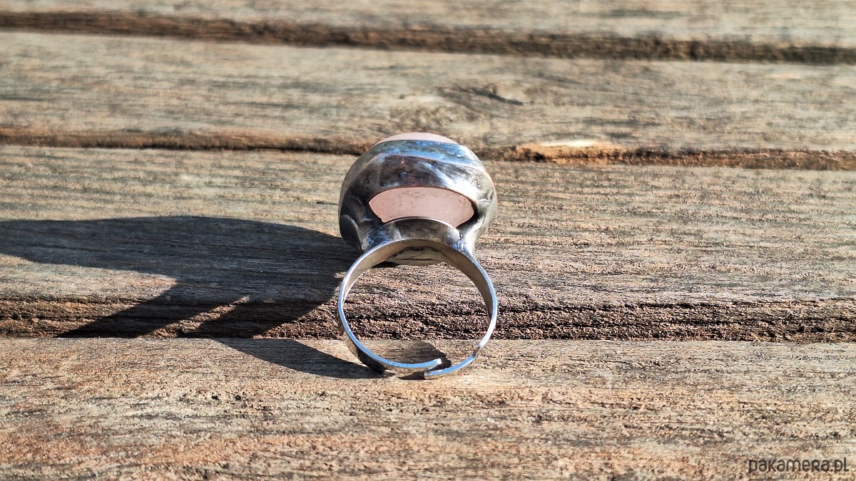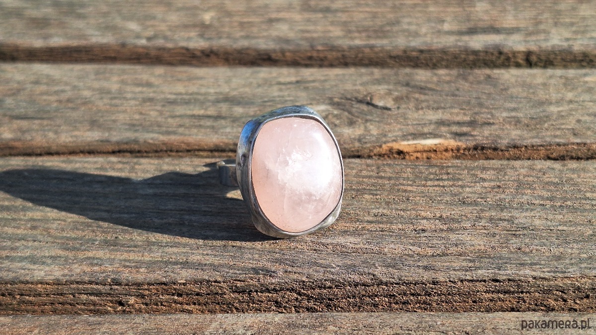 Pierścionek wykonany z miedzi, cyny i różowego kwarcu. Wymiary ok. 2.5 na 2 cm. Regulowany. Nie jest ciężki.
