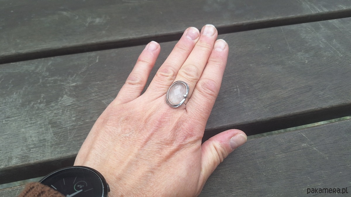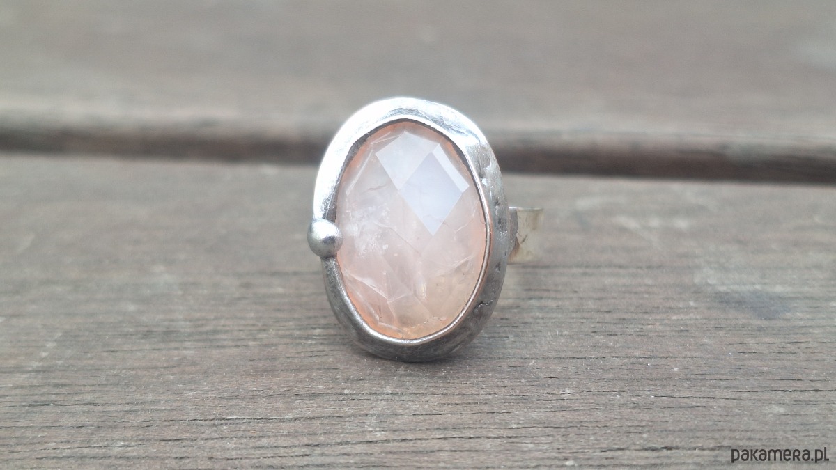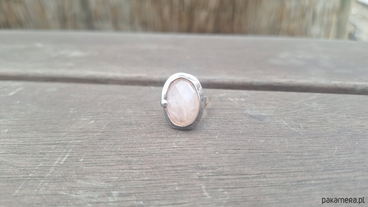Pierścionek wykonany z miedzi, cyny i różowego kwarcu. Wymiary ok. 2 na 1.5 cm. Regulowany. Nie jest ciężki.